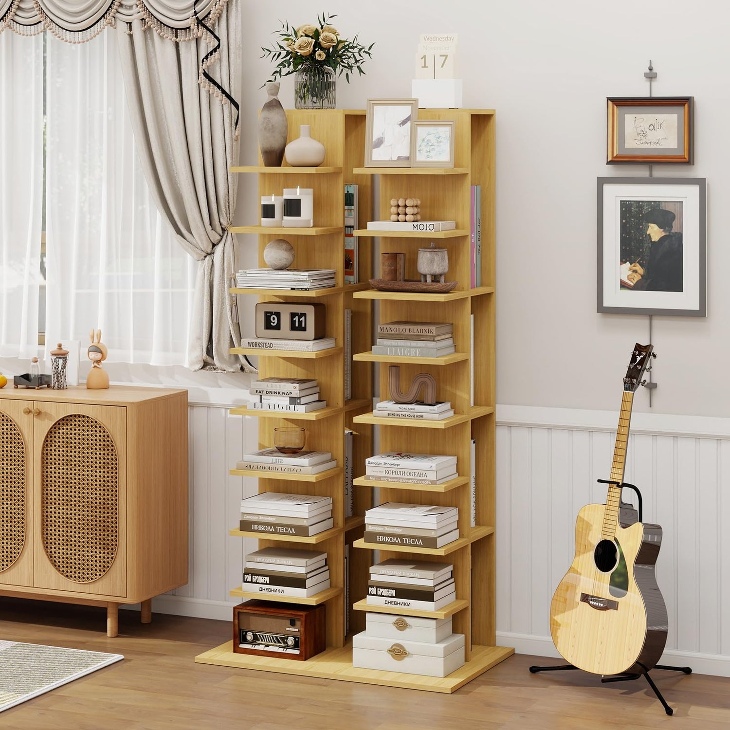 - Multifunctional Storage Solution: Customize your storage to fit your life! The versatile Vertical Spine Bookshelf Tower offers 13 tiers of varying heights. As seen in the comparison image, it effortlessly holds books, decorative items, storage boxes, plants, and even an acoustic guitar, truly fitting your storage needs