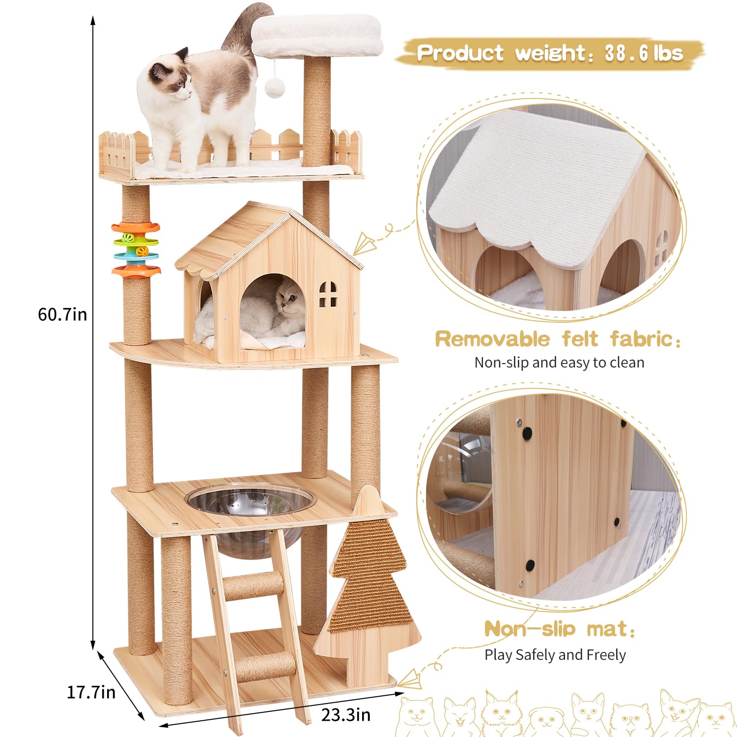 - Easy to Clean: The felt fabric is slip-resistant and comfortable, and can be removed for washing. Plus, the smooth surface of the cat tree makes it easy to wipe away hair and dirt, giving your fluffy buddy a cleaner, more hygienic space