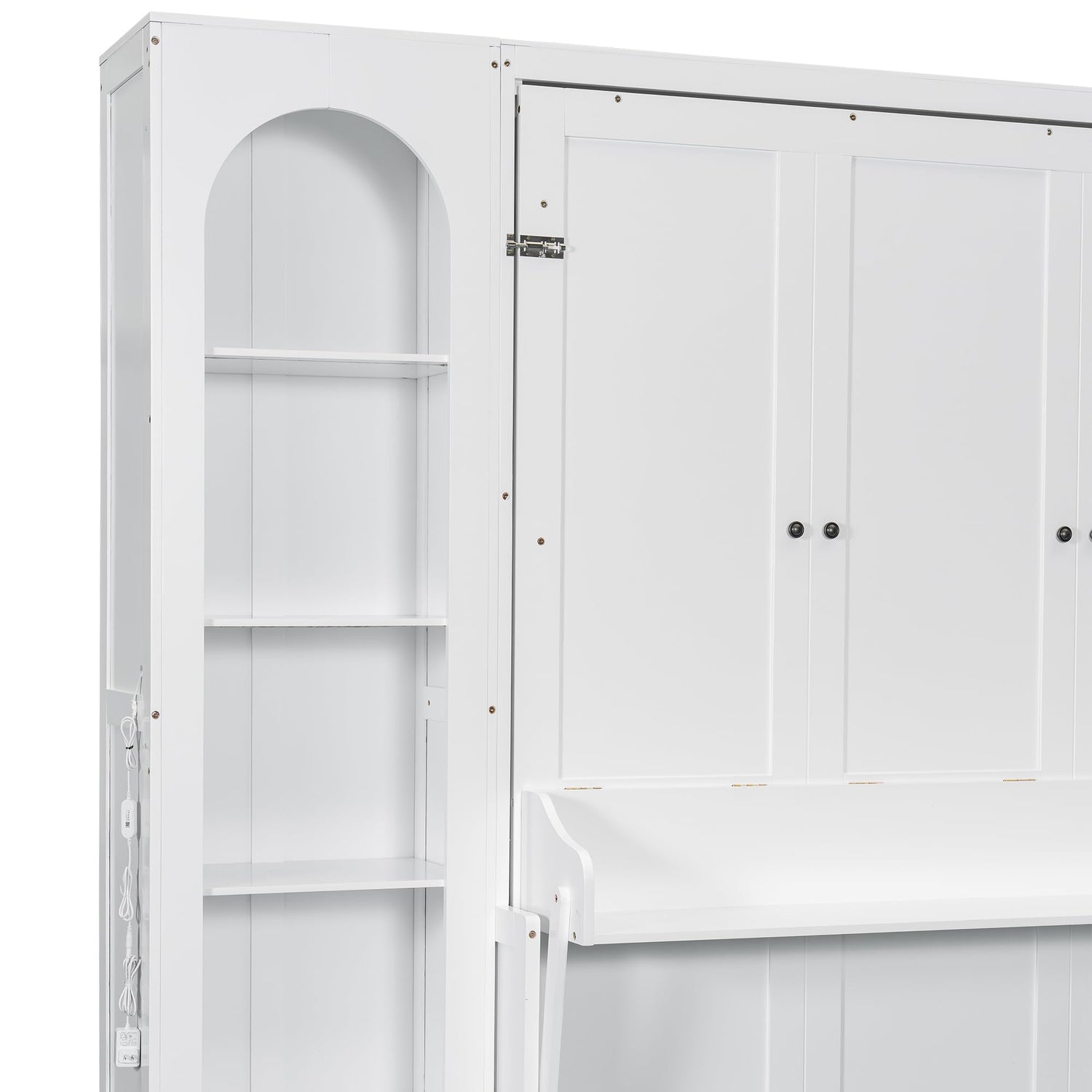 Elegant Queen Size Murphy Bed with Shelf, Side Cabinets, Drawers and LED, Cabinet Folding Wall Bed with Desk Combo Perfect for Guest Room, Office (White-2)