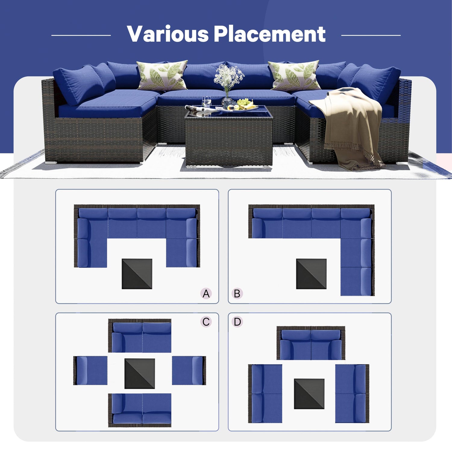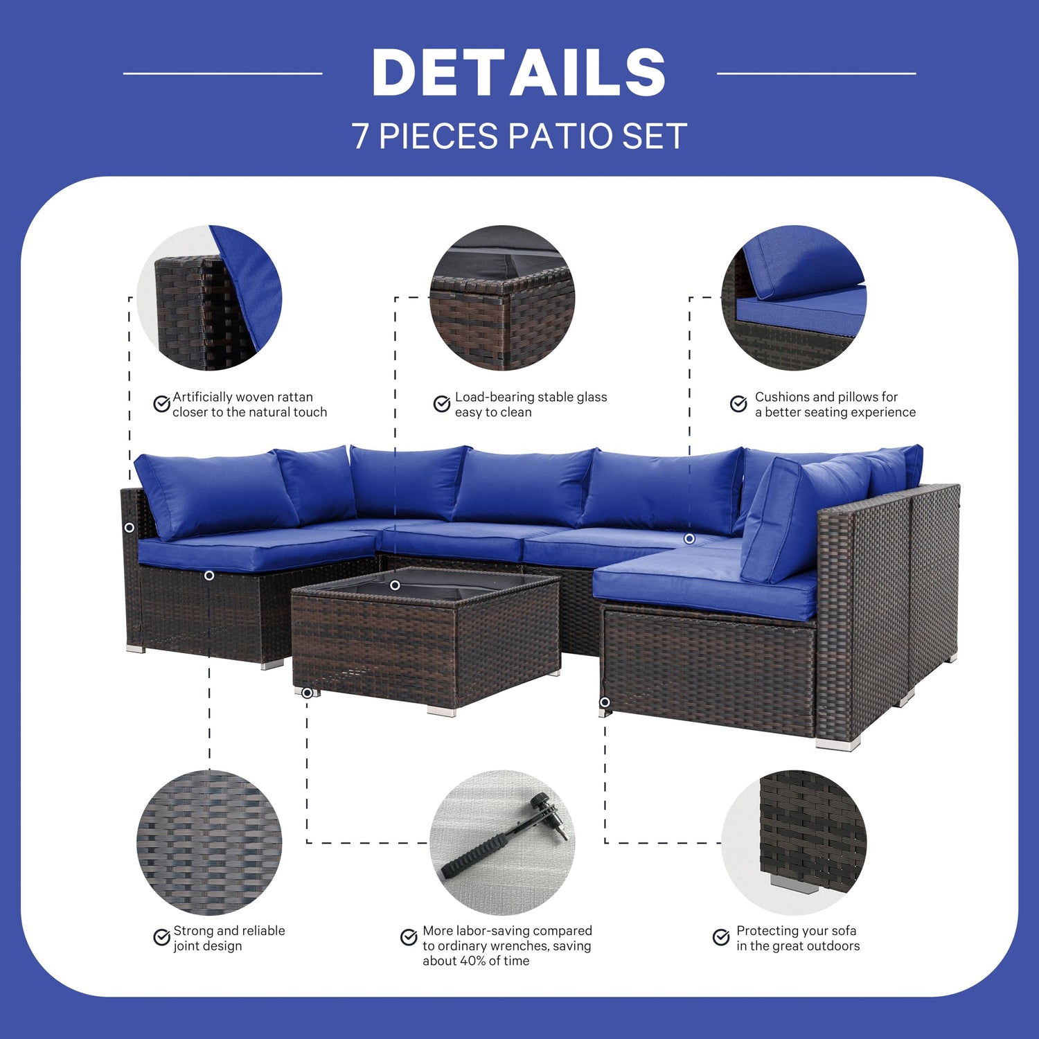 - OUTDOOR SOFA SET - The 7-piece outdoor sectional sofa features a sturdy steel frame that will never rust. Wicker is strong enough to withstand all weather changes. Thick waterproof durable cushions and tempered glass are easy to clean. Enjoy your great afternoon!