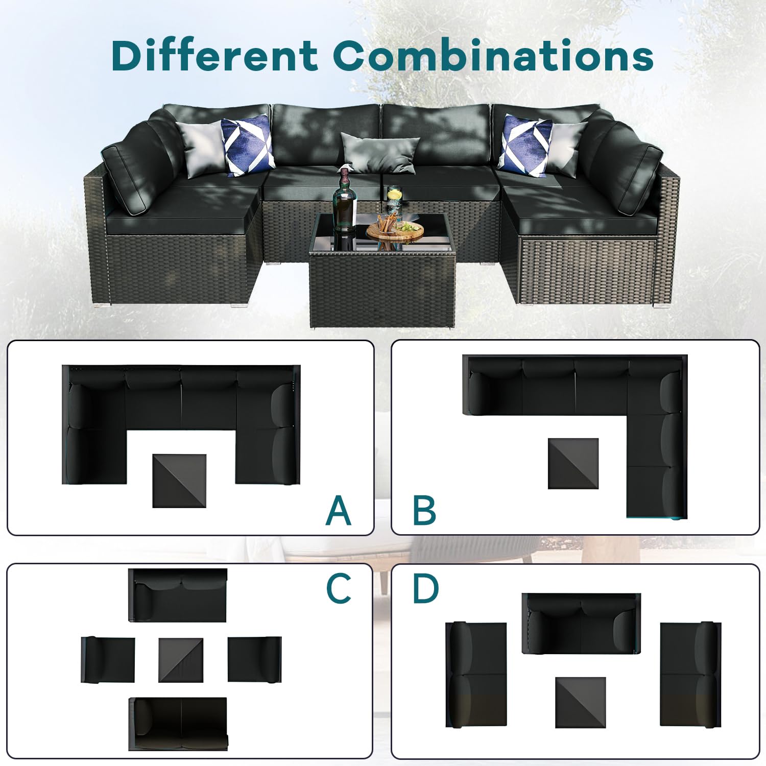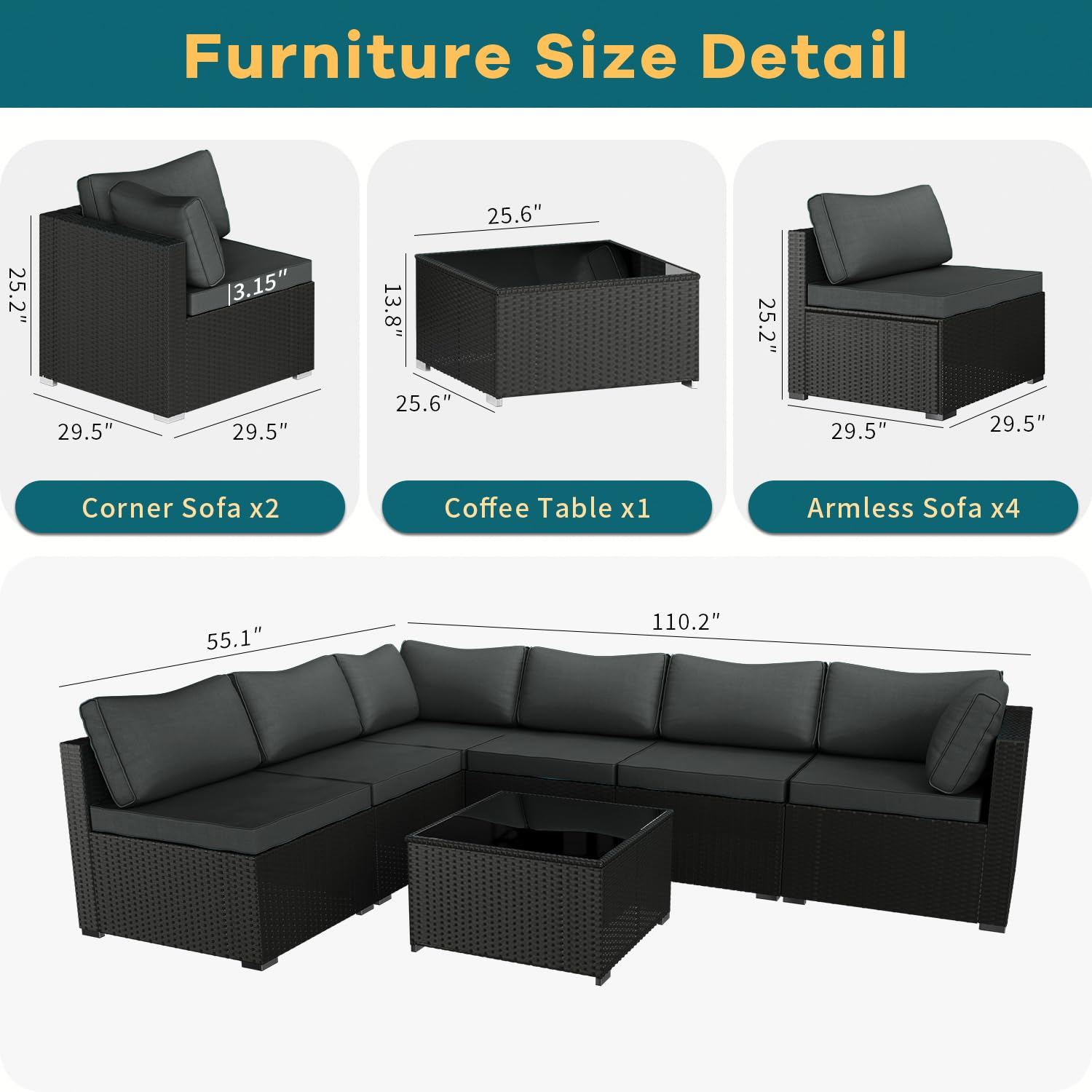 - OUTDOOR SOFA SET - The 7-piece outdoor sectional sofa features a sturdy steel frame that will never rust. Wicker is strong enough to withstand all weather changes. Thick waterproof durable cushions and tempered glass are easy to clean. Enjoy your great afternoon!