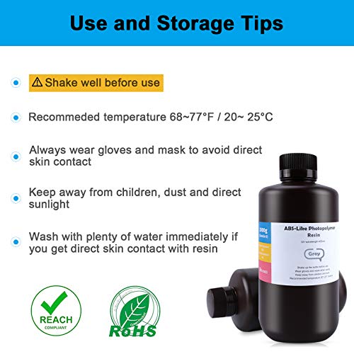 - 【High Precision and Low Shrinkage】 ELEGOO ABS Like resin has excellent stiffness and toughness, specially designed for reducing volume shrinkage during the photocuring process, which bring smooth surface with great resolution for print model.