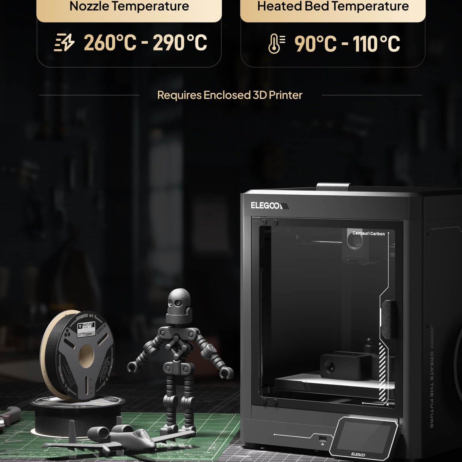 - Compatibility & Tips - Universally compatible with most enclosed 1.75 mm FDM 3D printers. It’s recommended to use hardened steel nozzle with a diameter of no less than 0.4 mm at a print temperature of 260-300 °C and a hotbed temperature of 100-120 °C