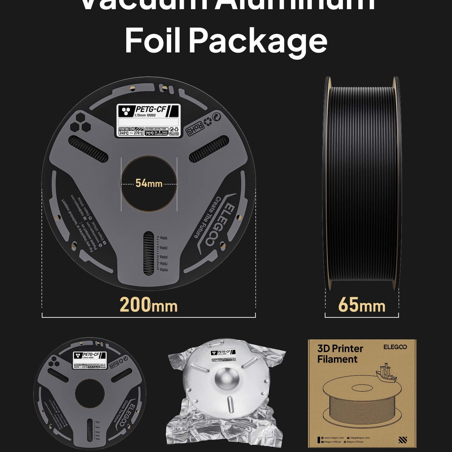 - Outstanding Mechanical Properties - ELEGOO PETG-CF filament is made from a combination of PETG and carbon fibers. Carbon Fiber adds strength to the material, making it ideal for printing functional parts and outdoor items