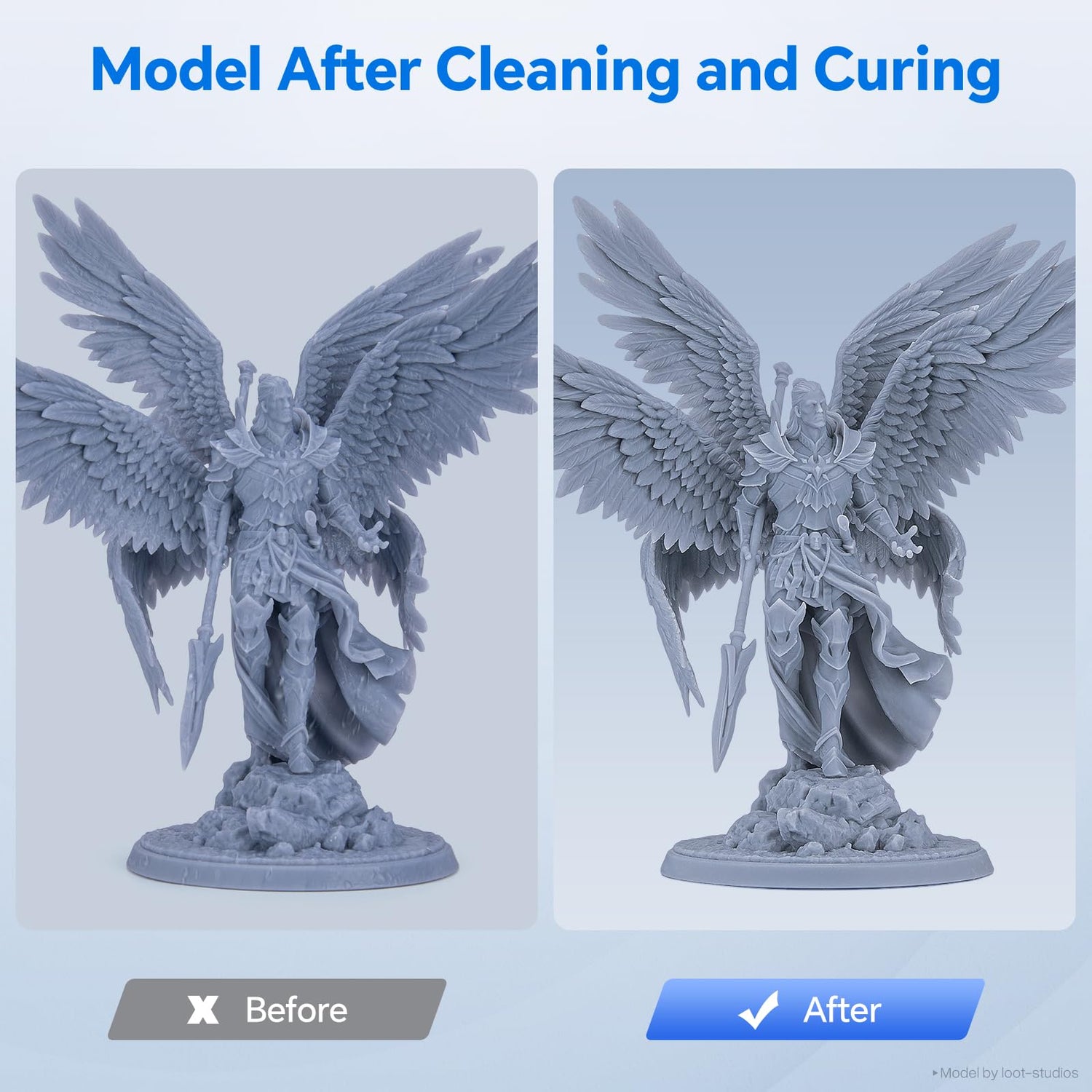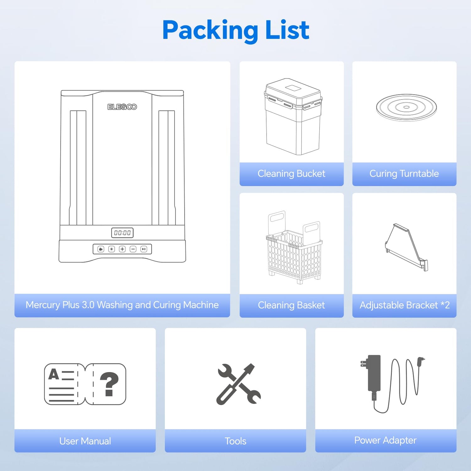 - 【2-in-1 Cleaning and Curing Design】ELEGOO Mercury Plus 3.0 supports one-step model post-processing. The powerful vortex of the cleaning station cleans the model of excess resin, then dries and cures the model using the curing station