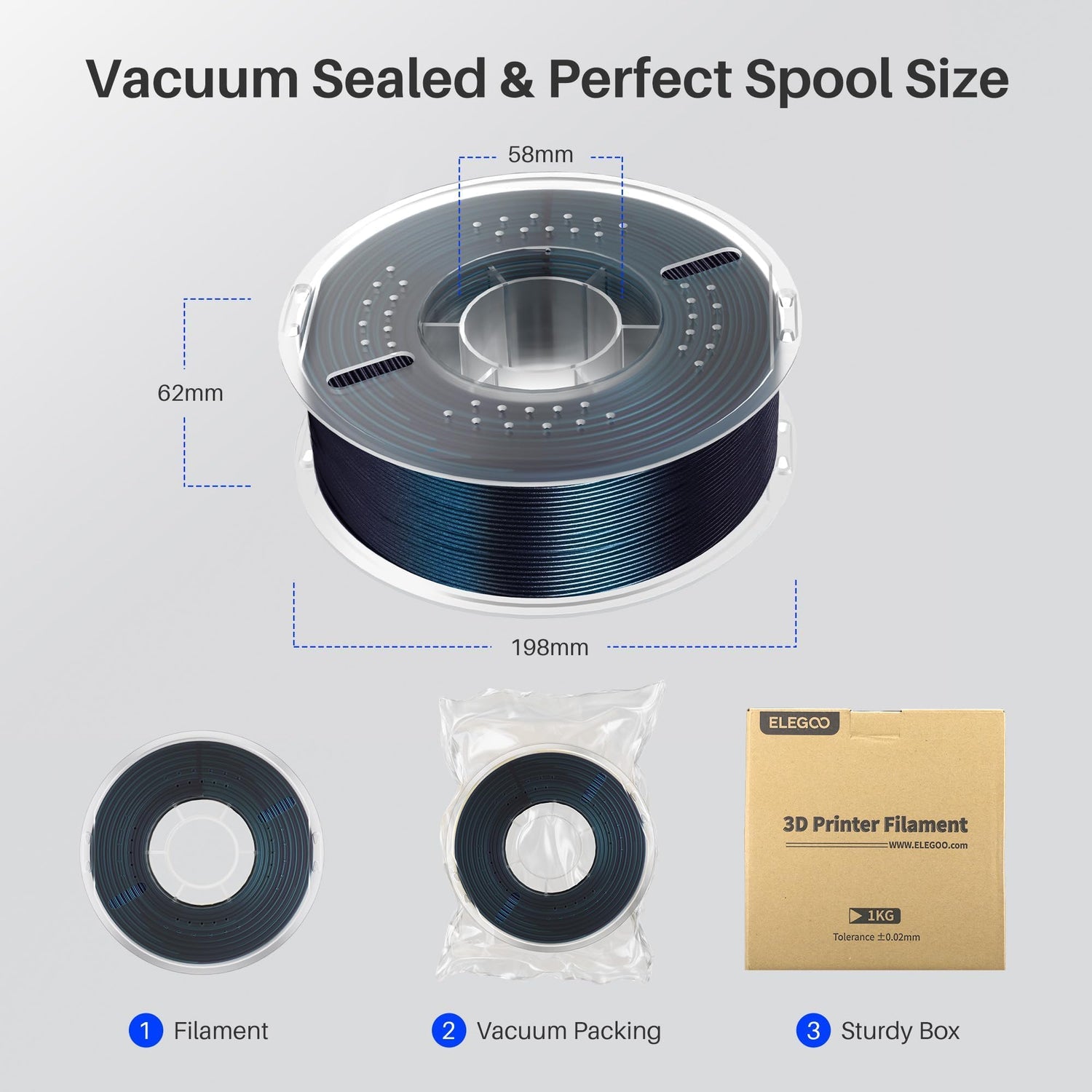 - AMAZING GALAXY COLORS: ELEGOO galaxy series pla is designed to give your prints a beautiful and glossy finish. The unique shinny colors will be slightly different depending on lighting conditions and the angle you look at it