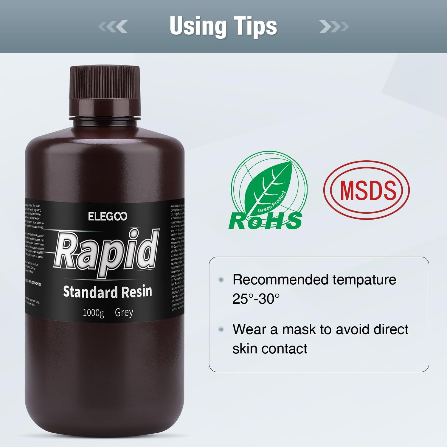 - 【Fast Curing & Excellent Fluidity】ELEGOO standard rapid resin has high fluidity and low viscosity. It can improve the curing speed and shorten the time without any impact on its quality.Make you have a efficient printing experience
