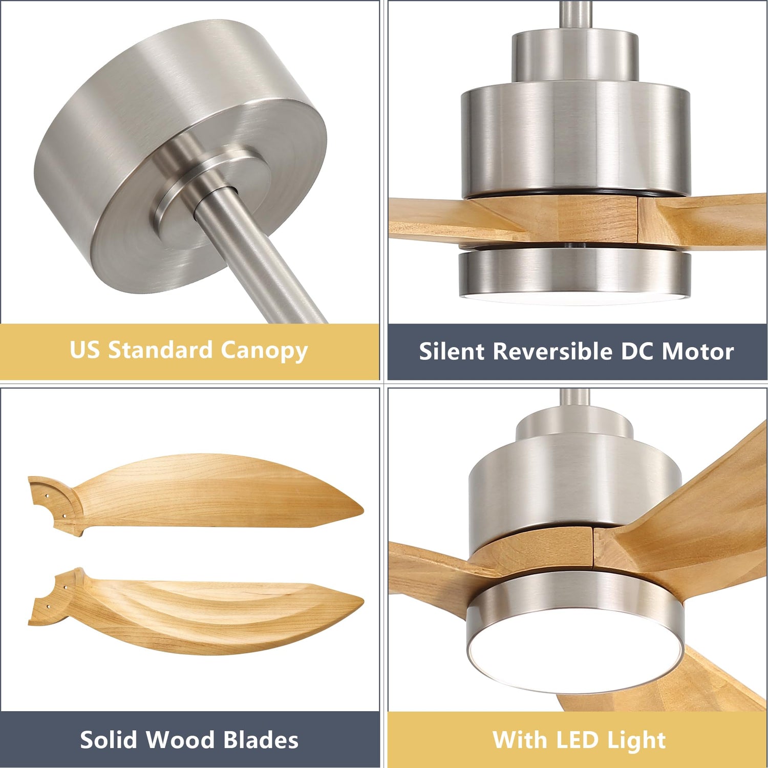 ELEHINSER 52" Wood Ceiling Fan with Lights and Remote Control, 3 Blades 6-Speed Dimmable Light Reversible DC Motor Ceiling fan for Kitchen Bedroom Dining Living Room, Wood Blades with Nickel