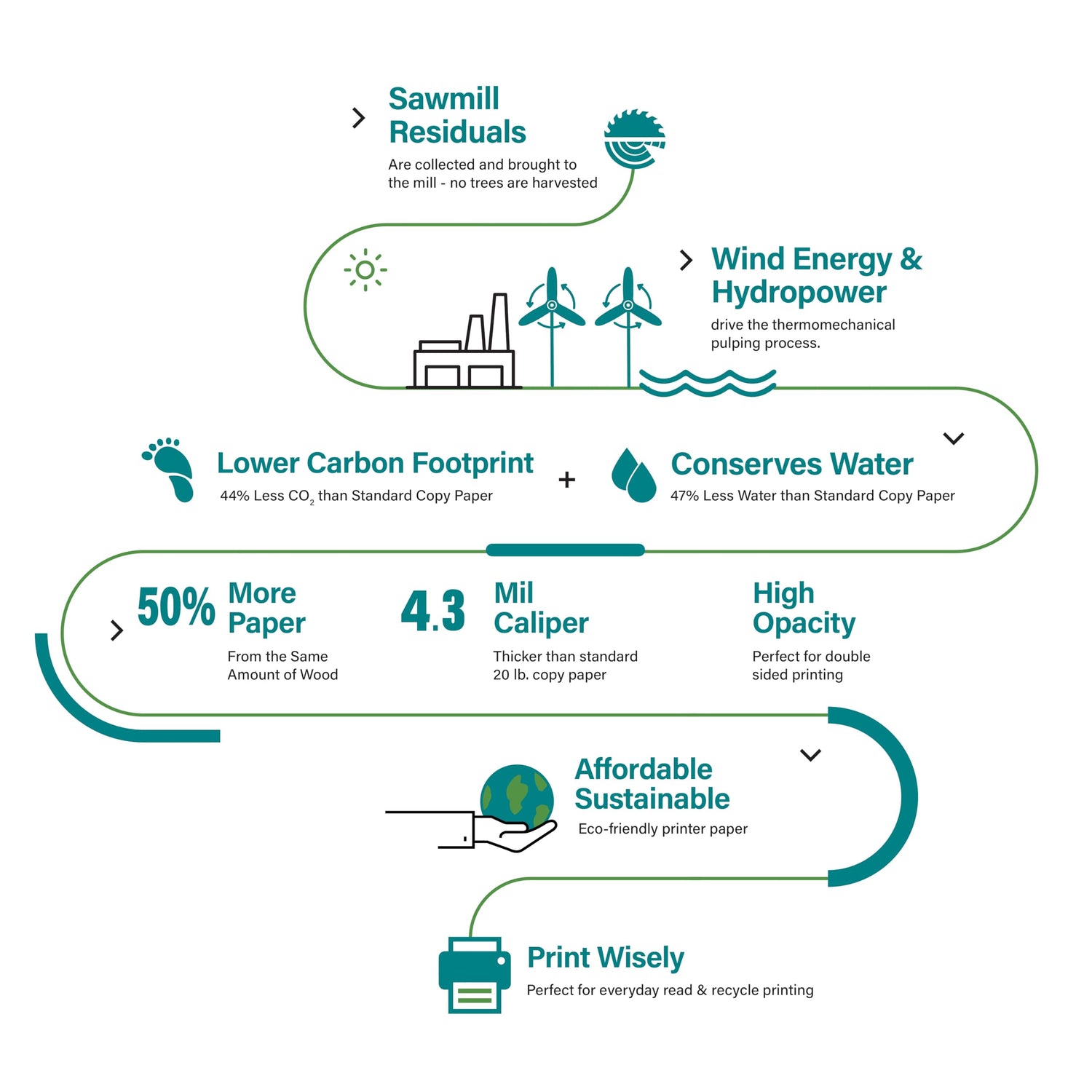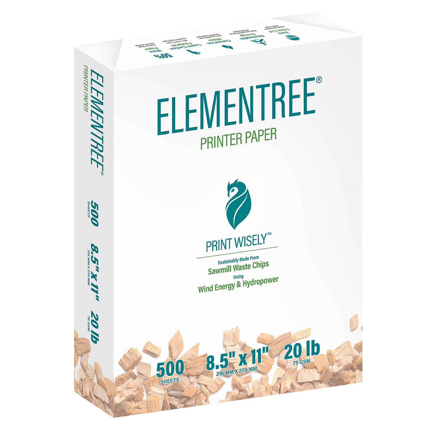 Details: Elementree Printer Paper is the affordable copier paper option for use at home, school, and in the office. It’s an office supply staple and is great for everyday printing of reports, presentations, research papers, class assignments and more. By choosing Elementree you are supporting a sustainable process that has a low impact on the environment as well as your budget; Elementree is made from sawmill waste chips with a pulping process that yields 56% more paper from the same amount of wood as compared to standard copy paper. With zero trees cut, forests in the USA can continue to thrive and purify the air naturally. The paper making process is also driven by hydropower, which uses 47% less water and generates about half the carbon footprint of standard copy paper. Our printer paper is a low impact, sustainable option that is thicker than normal copy paper and ideal for double-sided printing, which means fewer sheets of paper used per project. An Elementree ream of paper has a smooth finish and runs easily on personal printers, high speed office laser printers, and inkjet copiers. Make the wiser choice for your projects and for the environment with Elementree Sustainable Printer Paper.