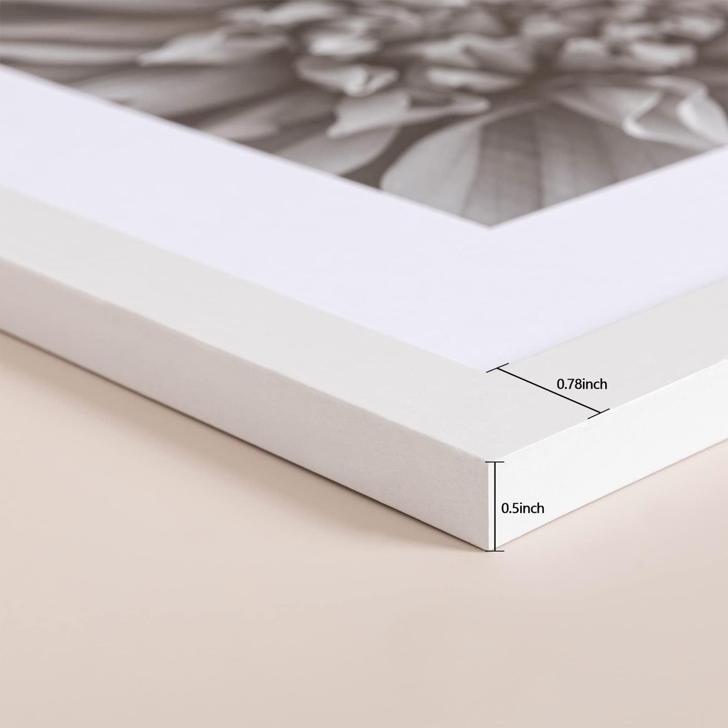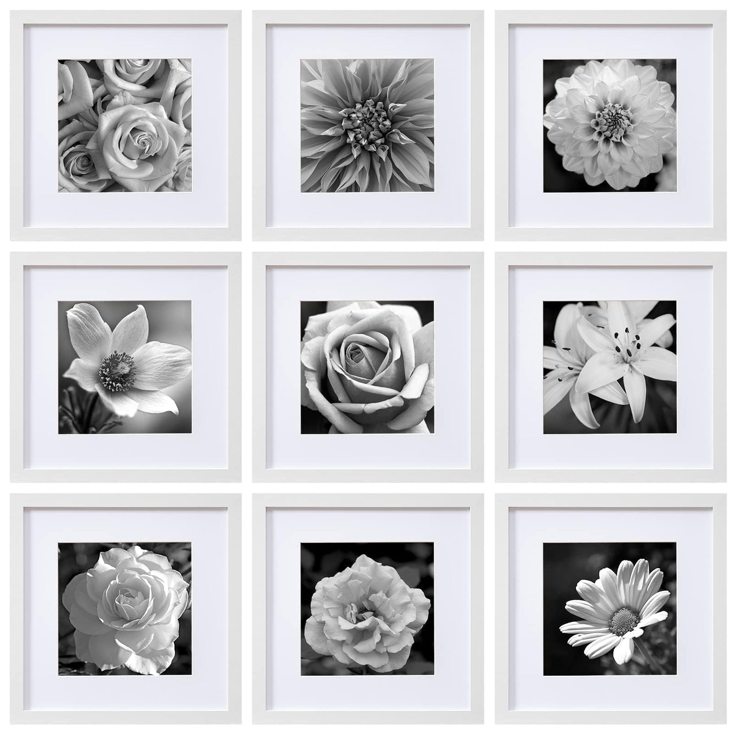 - Size and Quantity: This frame set includes 9 engineered wood frames, each measuring 12.9x12.9 inches with a 12x12 inch display area. The frames are suitable for 8x8 photos with the mat, or 12x12 photos without the mat. With a frame bar width of only 0.78 inches, they provide a marvelous surface for your display.