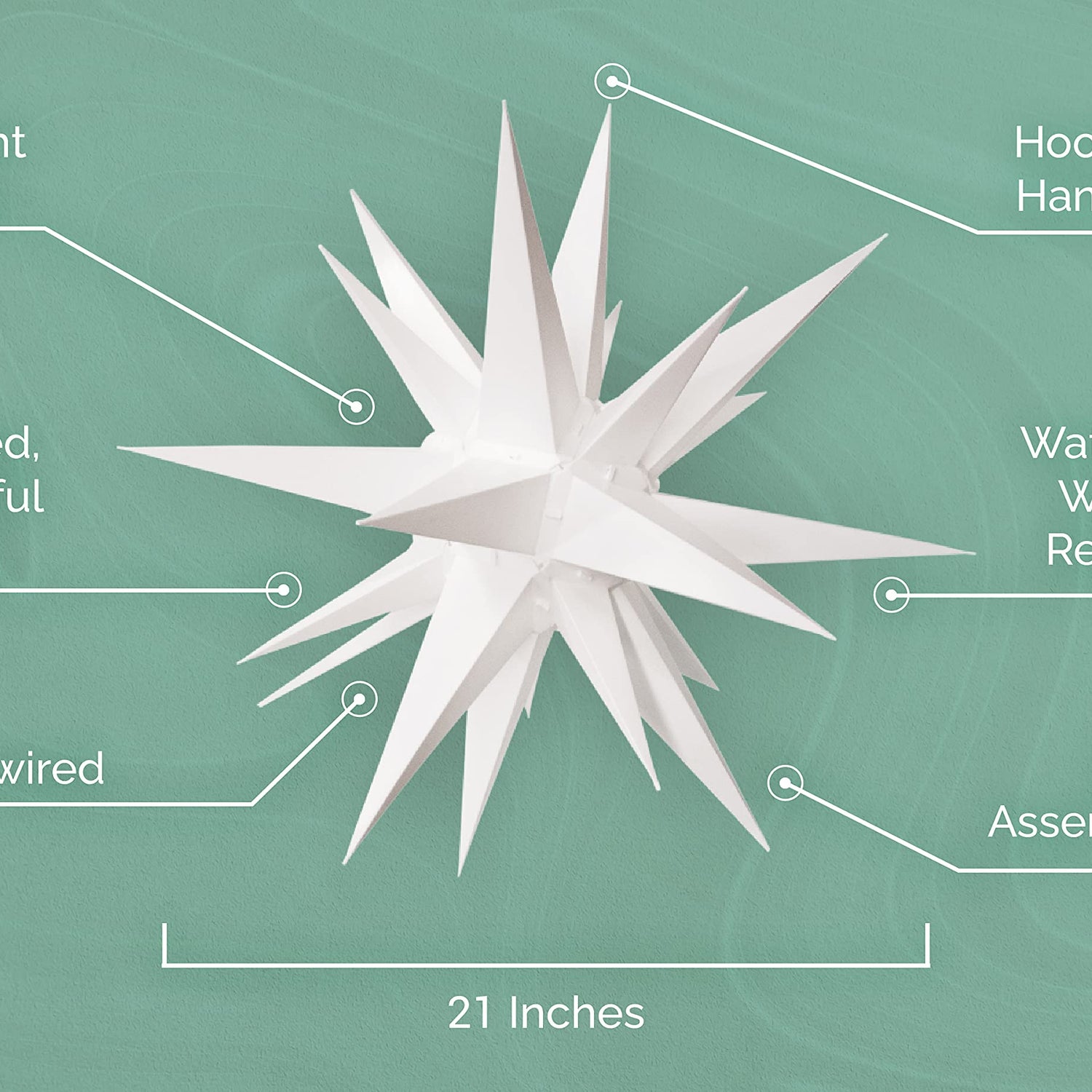 - 21” WARM WHITE LED GLOWING MORAVIAN STAR: This beautiful large 21" lighted Moravian star will shine through the night! Our bright white Christmas star makes the perfect lighted advent star for the holidays on your porch, patio, or rooftop. Match your white Christmas lights with this warm white star.