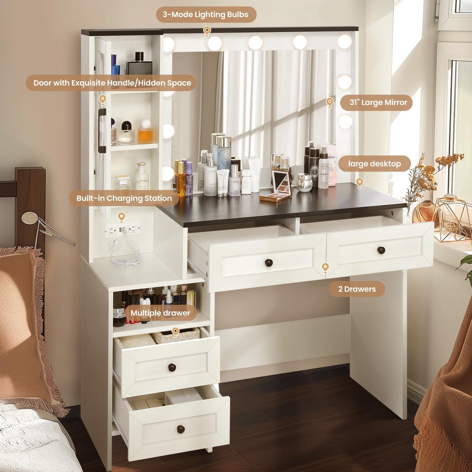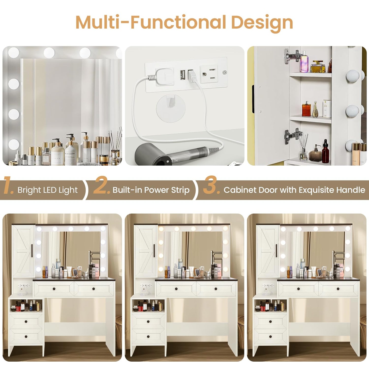 elifine Vanity with Lighted Mirror - Farmhouse Makeup Vanity Desk with 4 Drawers, 1 Cabinet and Power Outlet, 3 Color Lighting Modes Adjustable Brightness