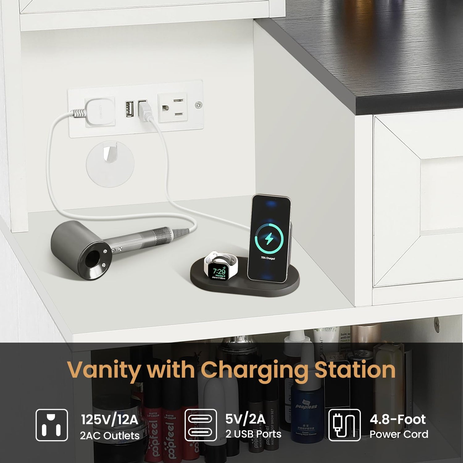 - 🔌[Built-in Charging Station] This make up vanity adds 2 standard plug sockets, 2 USB ports and 4.8 feet power cord that can be easily connected to the power supply. Make it convenient for you to use hair dryers, curling irons, beauty devices and charge.