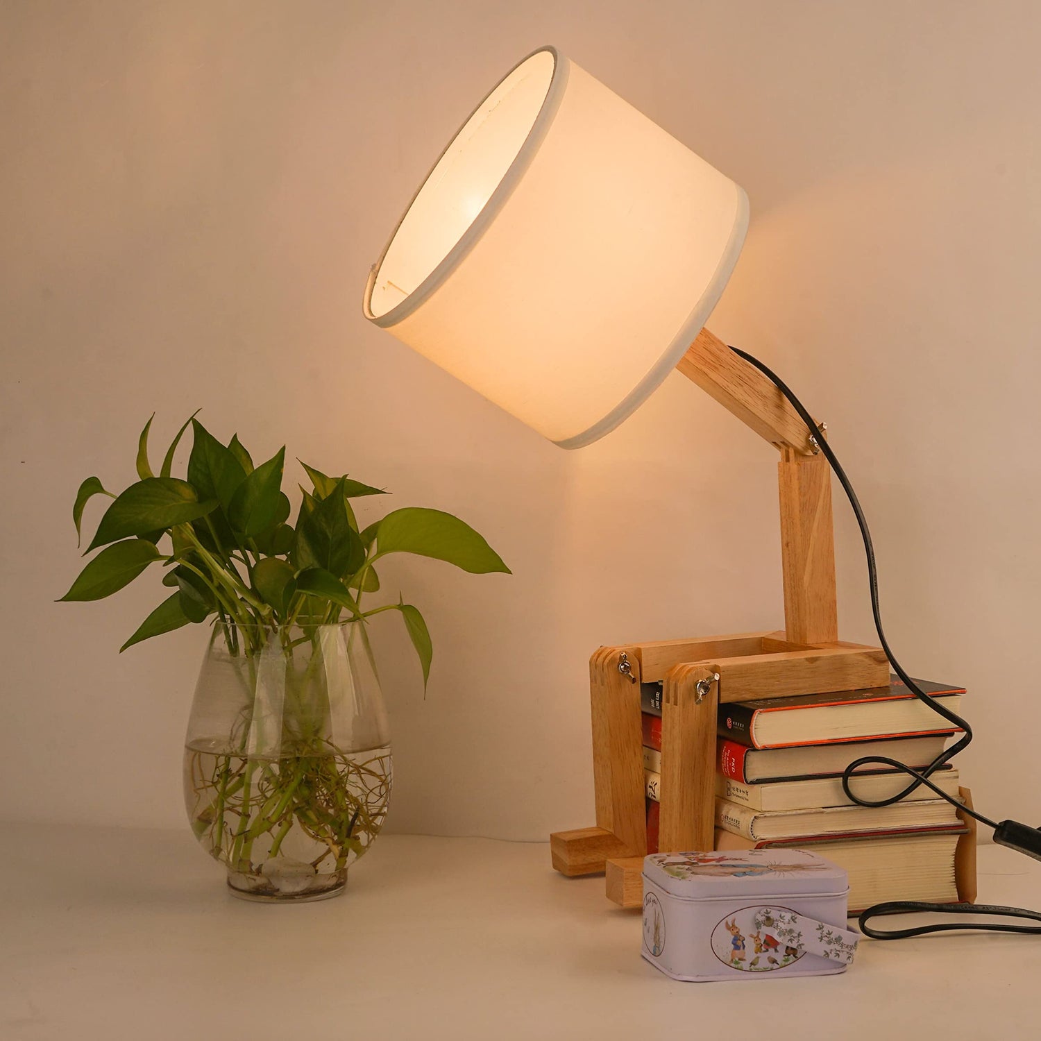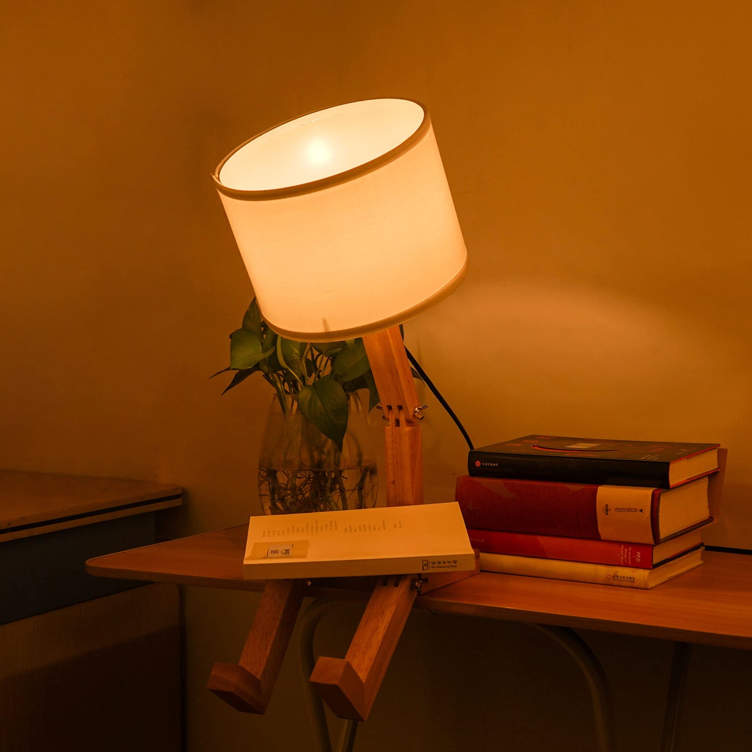 - UNIQUE SHAPE DESIGN: The table lamp is made of natural wood base and ivory white linen lampshade,Creative foldable design, this robot desk lamp's joints not only can be twisted freely, put different shapes according to your different needs.