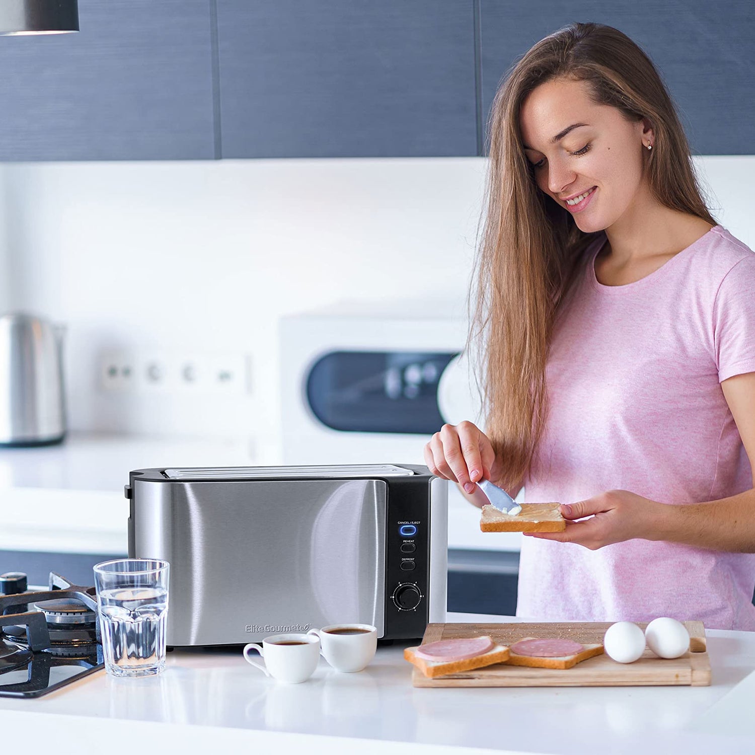 Elite Gourmet ECT-3100 Long Slot 4 Slice Toaster, Reheat, 6 Toast Settings, Defrost, Cancel Functions, Built-in Warming Rack, Extra Wide Slots for Bagels & Waffles, Stainless Steel & Black
