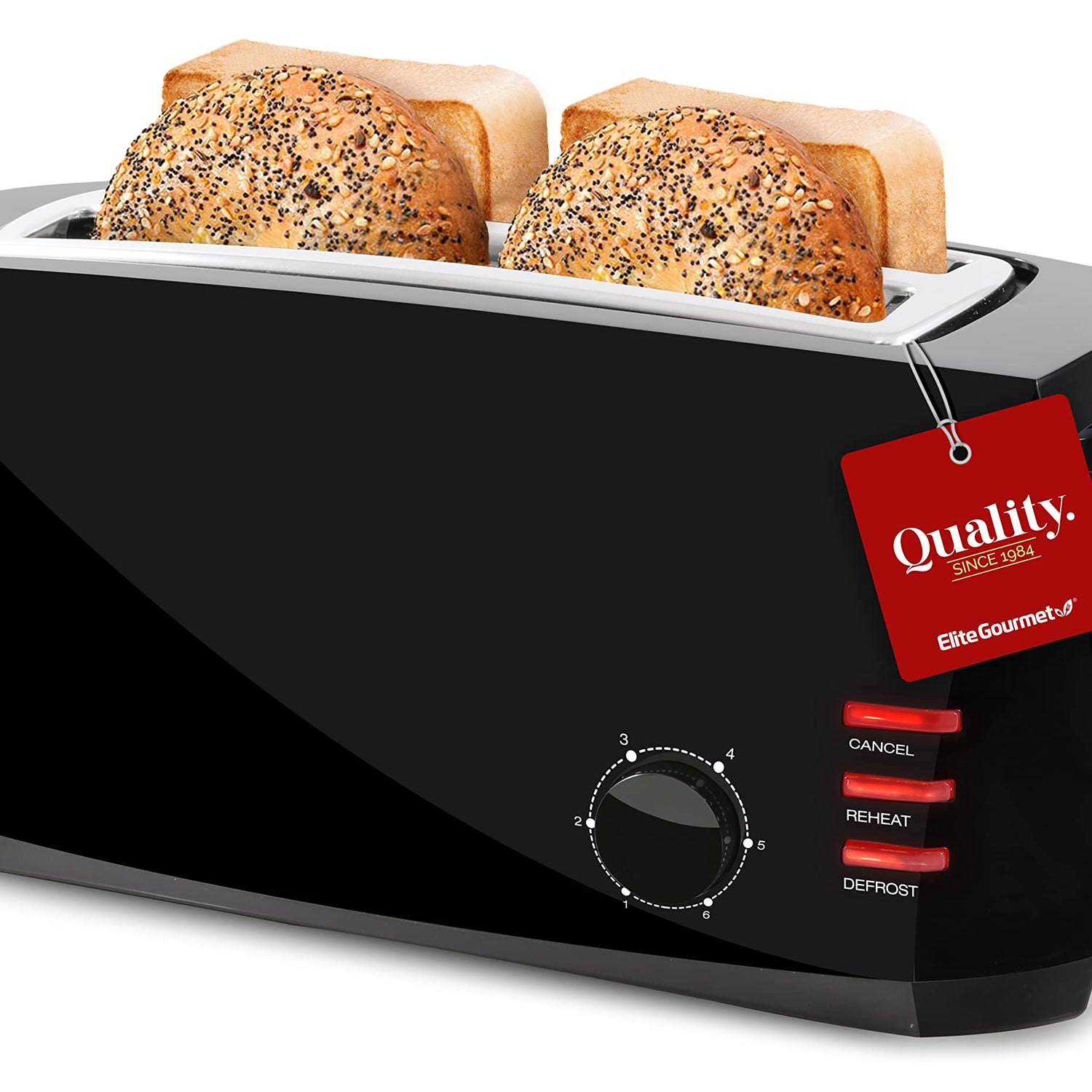 Details: Elite Gourmet Long Slot 4 Slice Toaster is a beautiful addition to any kitchen. Enjoy a wide variety of your favorite breads with the large toasting slots which can accommodate longer, rectangular slices of bread such as sourdough or other artisanal loafs. It features 6 variable toast shade settings as well as Cancel, Defrost, and Reheat functions all encased in a sleek, cool-touch housing. The extra-long space saving design easily fits 4 slices of toast while not cluttering your countertop.