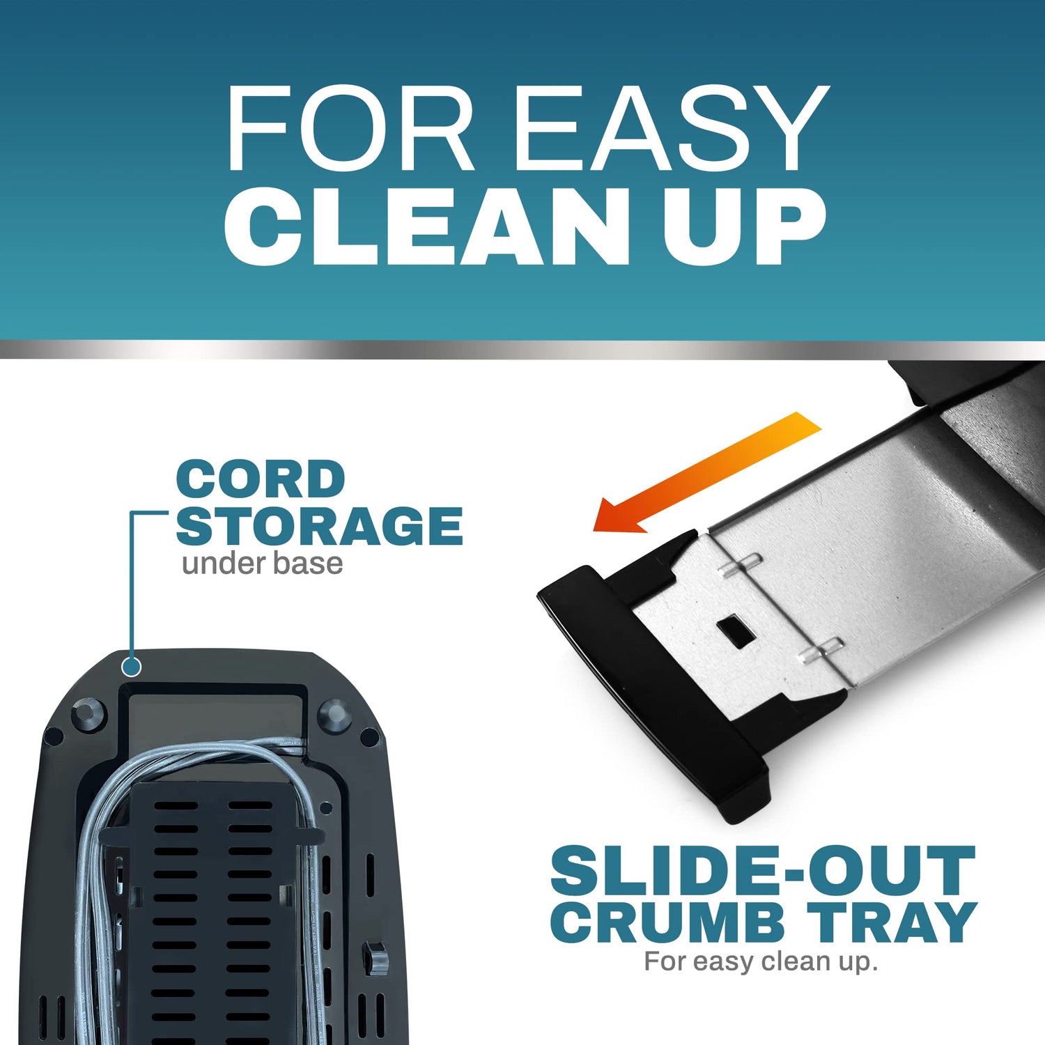 - Slide-Out Crumb Tray – Cleaning up crumbs or mess after multiple uses is easy thanks to a simple slide out tray that lets you empty it out and wipe it down by hand.