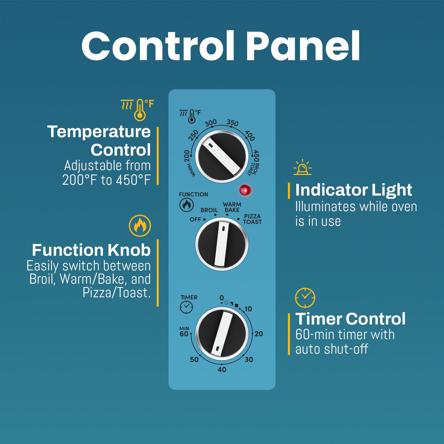 - ADJUSTABLE TIMER: The oven includes a 60-Minute timer with indicator bell and toast shade settings.