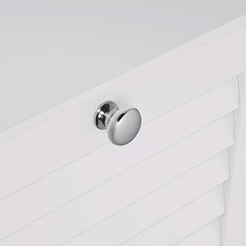 - Features a traditional shutter door design, polished silver knob, white painted finish and inset side panels.