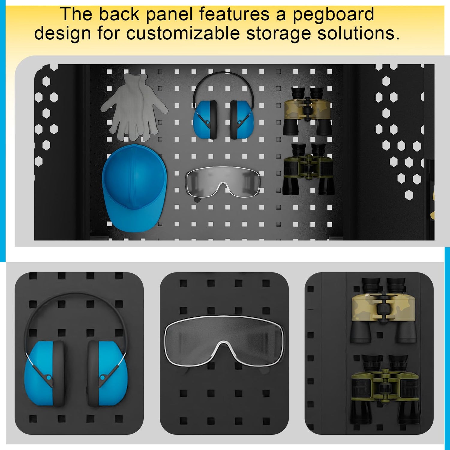 - 【DIY-friendly Design】The back panel of the gun safe features a perforated design, allowing for the attachment of pegboard hooks to hang various tactical gear, enhancing storage flexibility. The gun rack, top shelf, and hanging storage rack heights are all adjustable, providing greater flexibility in utilizing the sotrage space.(The package does not include pegboard board hooks)