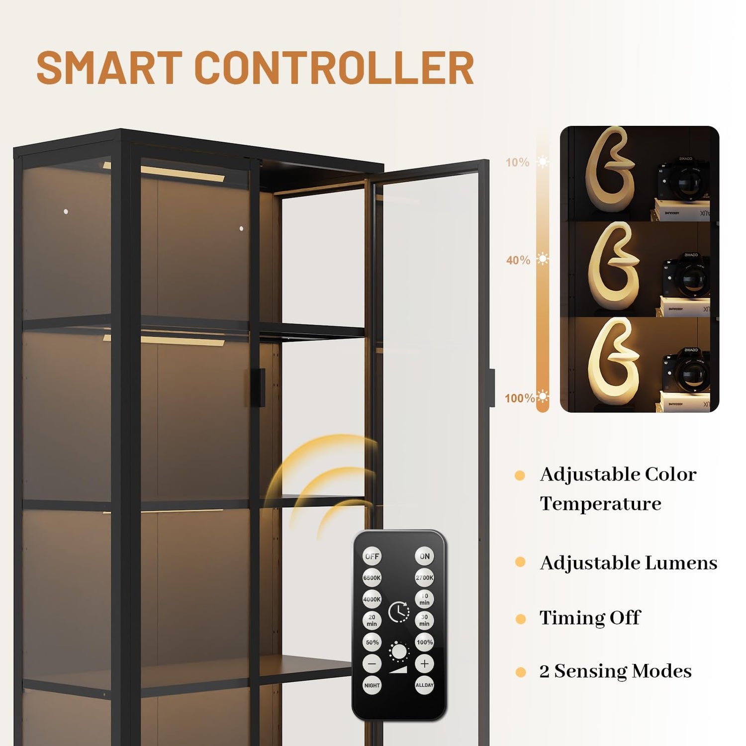- Smart Sensor Light:Eltean glass display cabinet is equipped with 4 magnetic sensor lights and a controller.The light has 3 modes: cold, warm and natural. The sensor light of the display cabinets will automatically turn on when it detects human movement within 3 meters, and turn off 15s after the human leaves. Display cabinets with lights not only provide lighting needs at night, but also save energy.Sensor mode can be turned off.