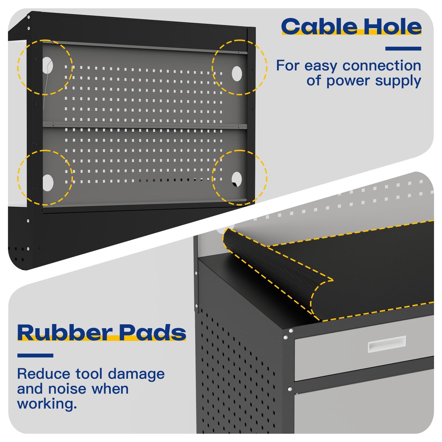 - 【Practical Design】Work table for garage is designed with 4 round holes on the back of the pegboard, which is convenient for you to connect the power supply. The workbench table is also equipped with rubber mats, which can reduce the damage of tools and also slow down the noise. The workbench's storage cabinets are also designed with magnetic doors and are equipped with keys and locks for added security. The drawers are also designed with slides for your convenience. Our workbenches ensure a comfortable working environment.