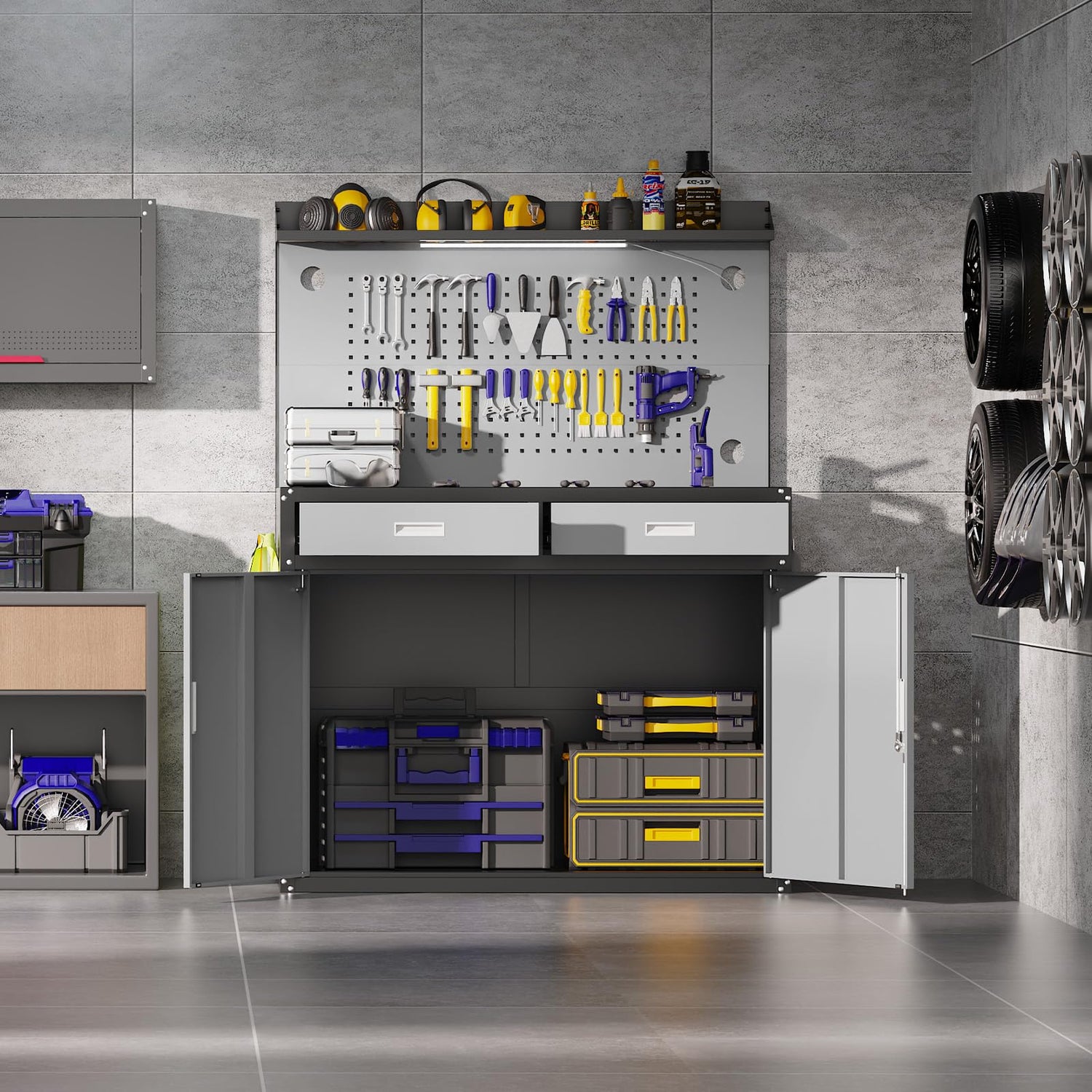 - 【 EASY STORAGE】Storage space for workbenches: 2 drawers for storing small tools; No-drill pegboard mounted on the tool bench for hanging equipment and avoiding wall damages; Top tray for small and frequently used items; Locking cabinet door to protect large items. This tool bench provides you with plenty of maneuvering space, whether it's in your garage, basement or workshop, this garage workbench is suitable for all kinds of needs.