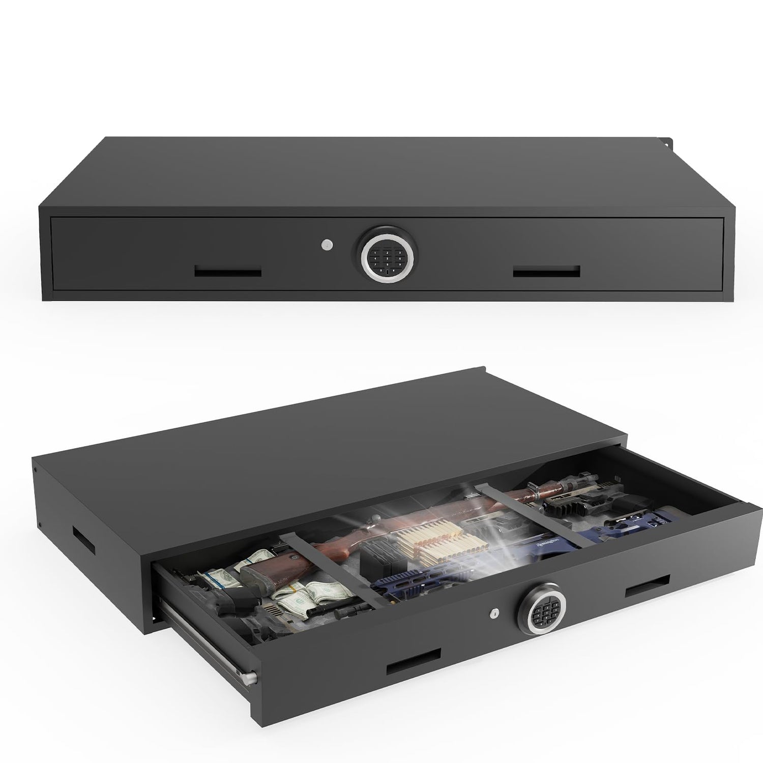 - Drawer Safe Design:Underbed gun safe dimension is:7"H x 48"W x 22"D. Holds guns, ammunition, jewelry, documents.Drawer slide out design makes it easy to have quick access to what you need when in use.Gun safes 7"height allows it to be placed under the bed, keeping valuables out of sight for ultimate privacy.