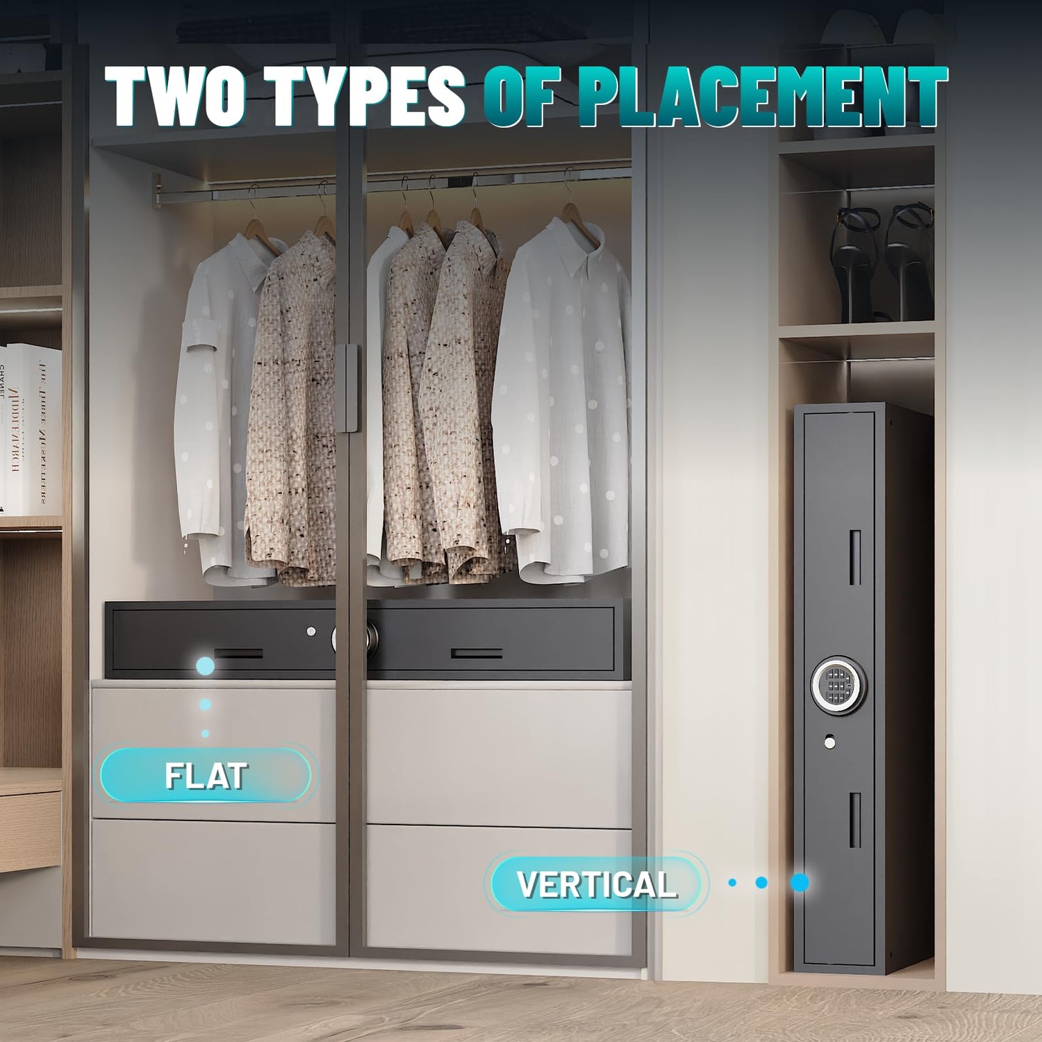 - Multiple Scenarios & Space Saving:48"extra wide slide out gun cabinet can store shotguns/rifles/handguns/ammunition/jewelry/computers and other valuables. Fully assembled gun cabinets is suitable for any scenario with two ways to use it vertically and flat. It can be hidden under a bed, in a closet, or on a bookshelf and in the trunk of a car. Make sure you can store your valuables safely.