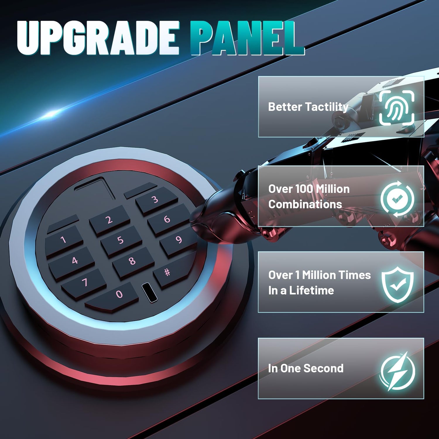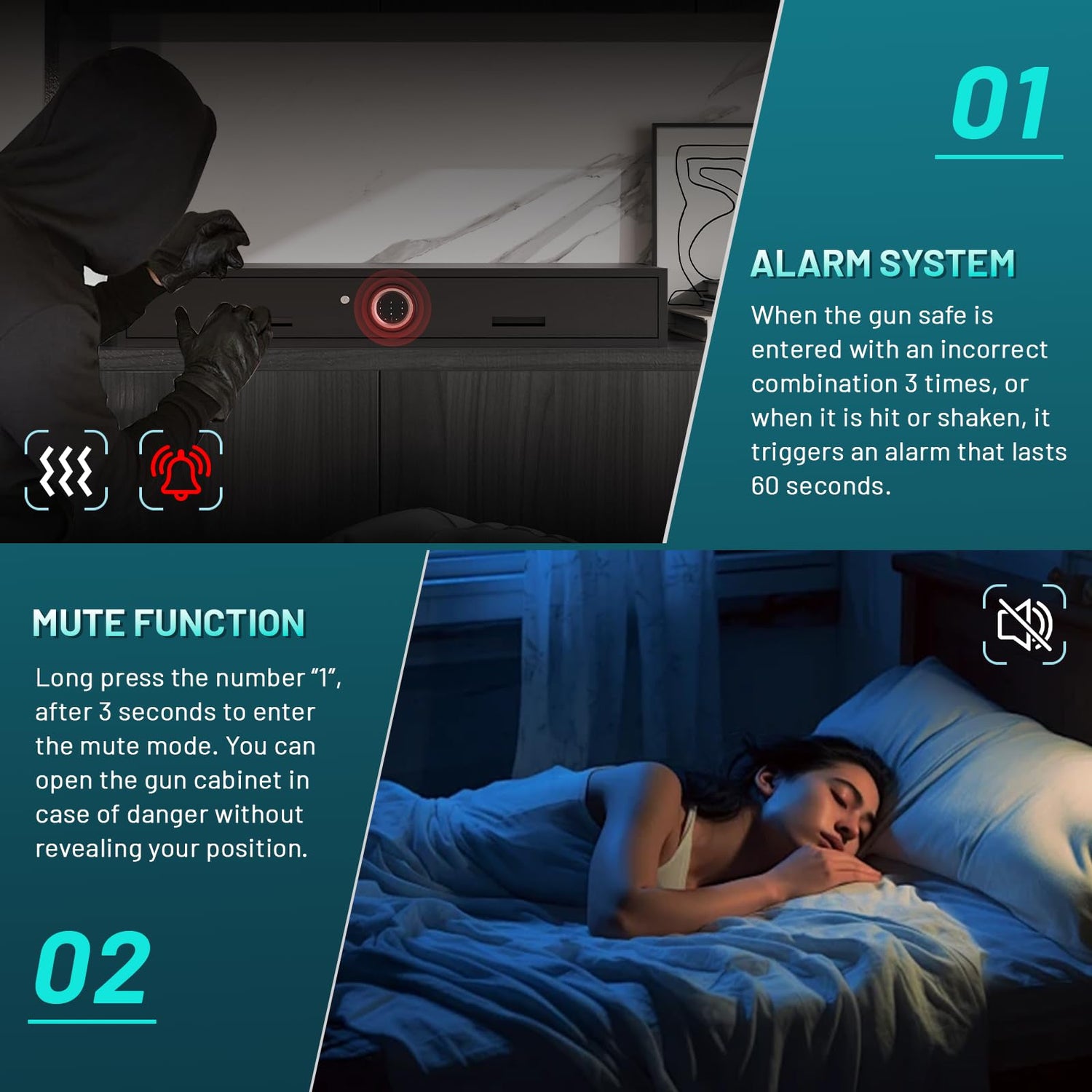 - Safe Protection & Lighting Design:Rifle safes for home activates the bell alarm function after 3 wrong passwords are entered. The alarm sound will last for 60s and can be canceled by entering the correct combination. When the vibration alarm is enabled, the alarm will be triggered by violent unlocking, shaking or bumping. Long press the number “1” to set the panel to silent mode, no sound will be made when opening the under bed gun cabinet. Upgraded multi-point LED light source, the lighting range is wider, which is convenient for you to find your desired firearms accurately and quickly in the dark.