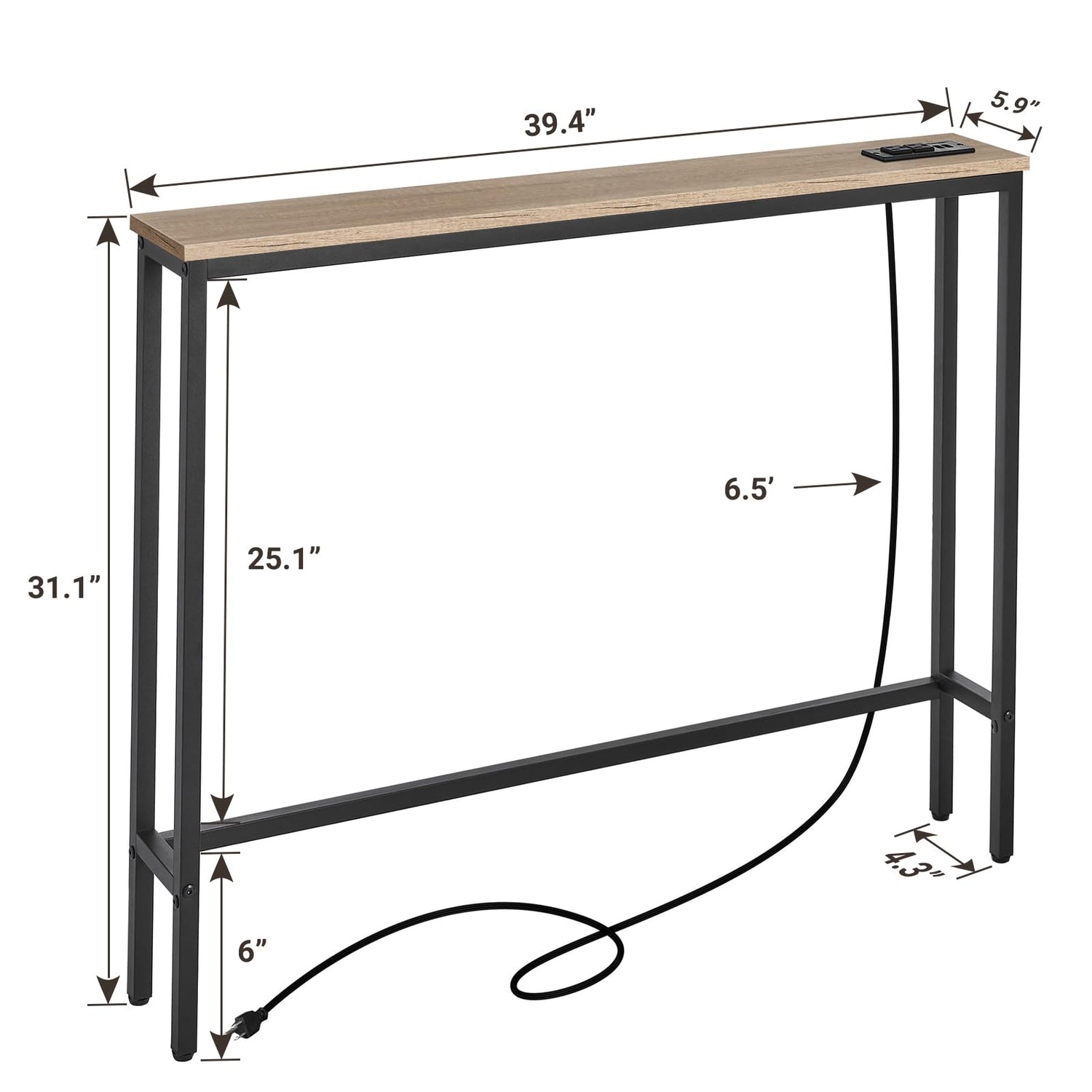 ELYKEN 5.9" Narrow Console Sofa Table with Power Outlets, 5.9" Dx39.4 Wx31.1 H Long Couch Table with Metal Frame and Charge Station with 6.5’ Extension Cord, White Oak