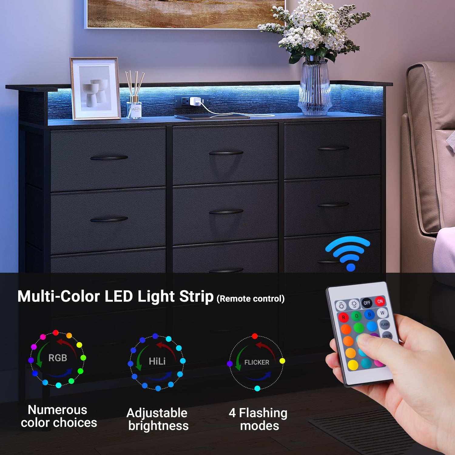 - Dresser with LED Lights: Transform your bedroom ambiance with this LED dresser! Simply connect it to the USB port and choose from 15 dimmable color options and 4 dynamic modes, all easily controlled by remote. Not only does our dresser enhance your room's décor, but it also serves as a practical storage solution, combining style with functionality to meet all your needs
