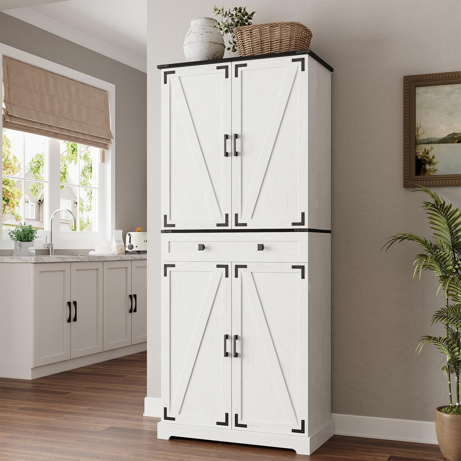 - Farmhouse Pantry Cabinet: Unique X-shaped door design and chic metal accents enhance the texture and spaciousness of this Pantry storage cabinet, while the off-white finish, antique metal handles, and exquisite wood grain detailing make this pantry cabinet a great statement piece to any kitchen or dining room, reflecting timeless farmhouse charm and creating a personalized and distinctive aesthetic