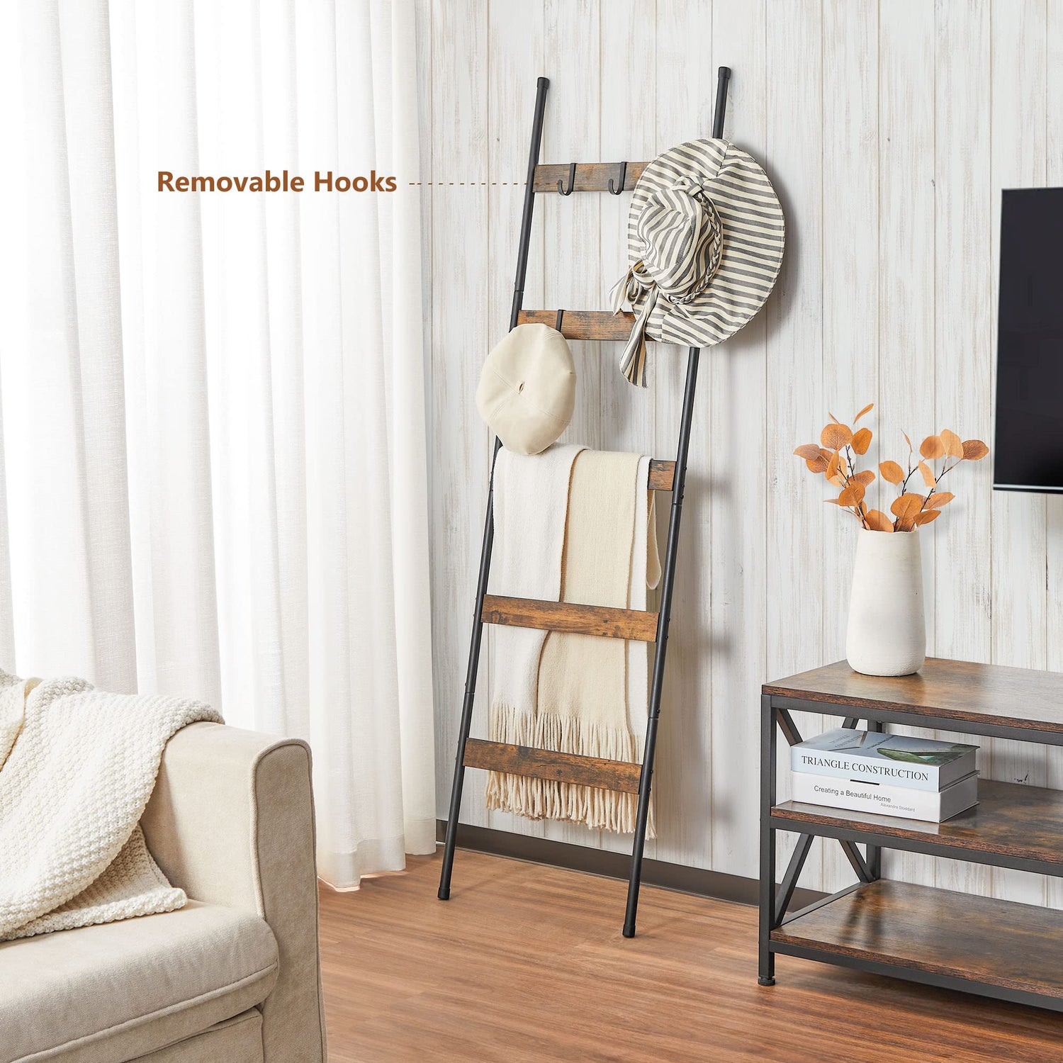 - Save Space: Sized in 63"L x 17.3"W with occupying almost no floor space but adds total 5 ladders and 4 removable hooks to store and hang blankets, while its light weight allows it to easy to move