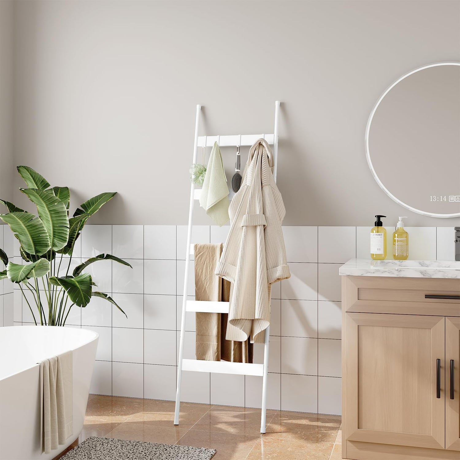 ELYKEN Blanket Ladder for Living Room, Farmhouse 5 -Tier Quilt Holder with 4 Removable Hooks for Bathroom, Wood Towel Rack Display, Wall Anchor Leaning Decorative Stand for Home Decor, White