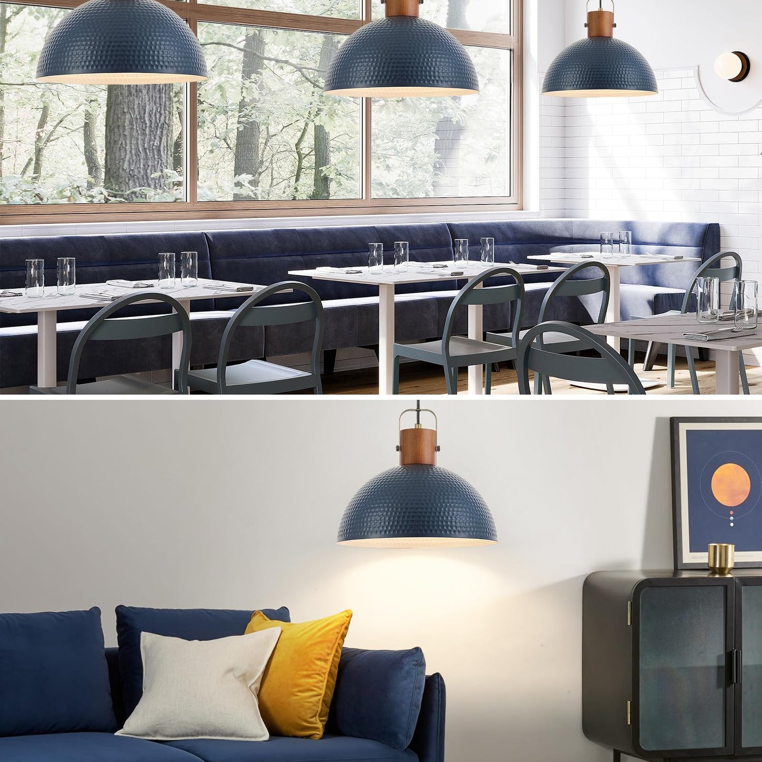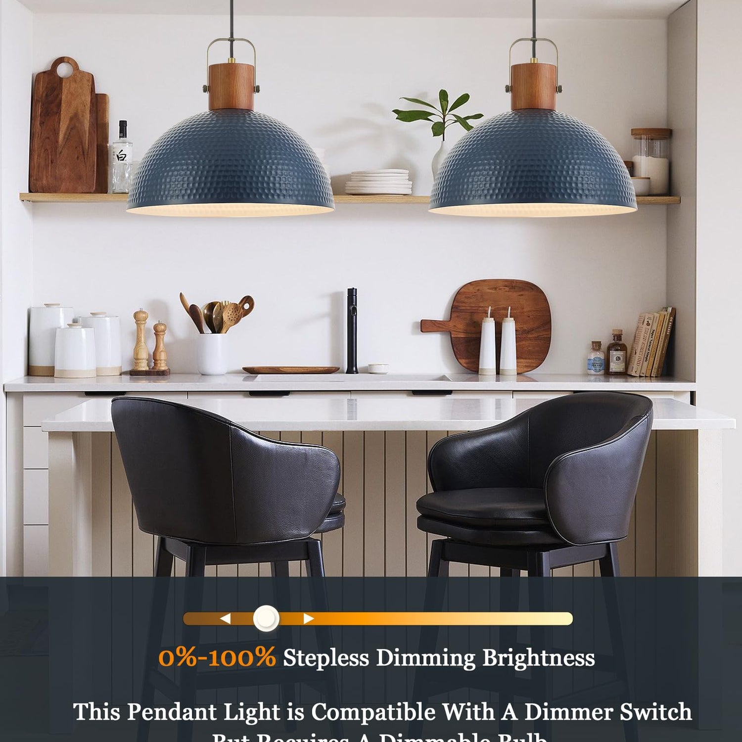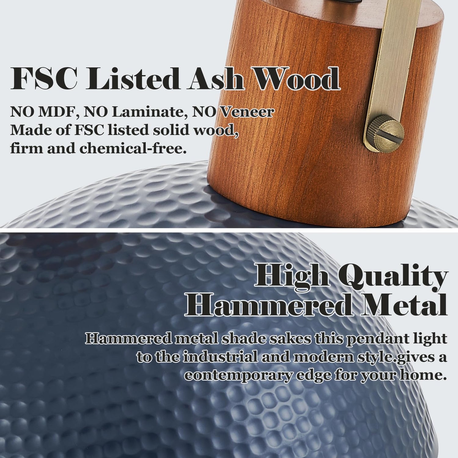 ELYONA 16” Large Ash Wood Pendant Light with Hammered Blue Metal & Brushed Brass Handle Large Pendant Light Fixtures Modern Dome Hanging Lamp for Kitchen Island, Dining Table, Bedroom, Hallway