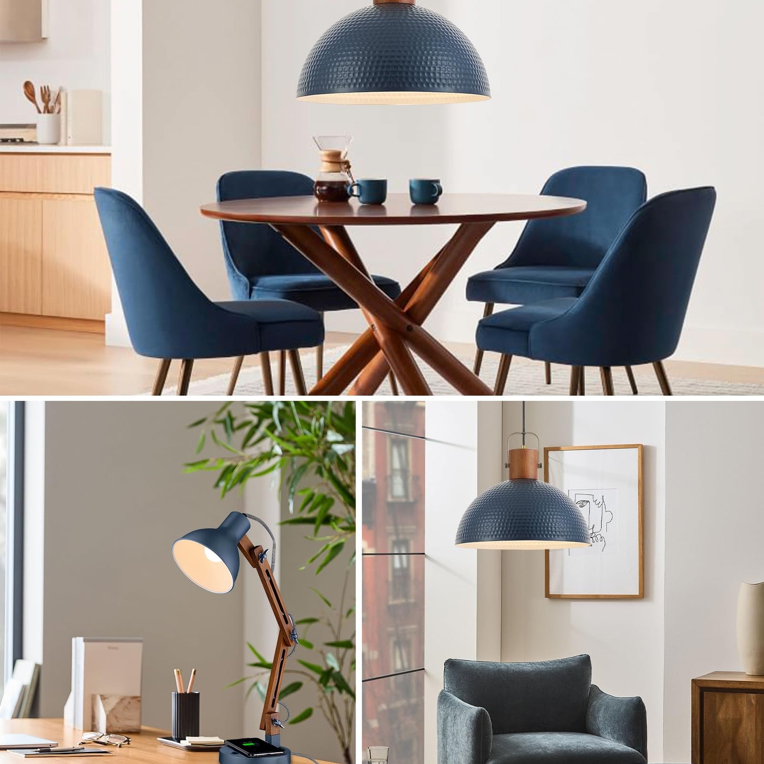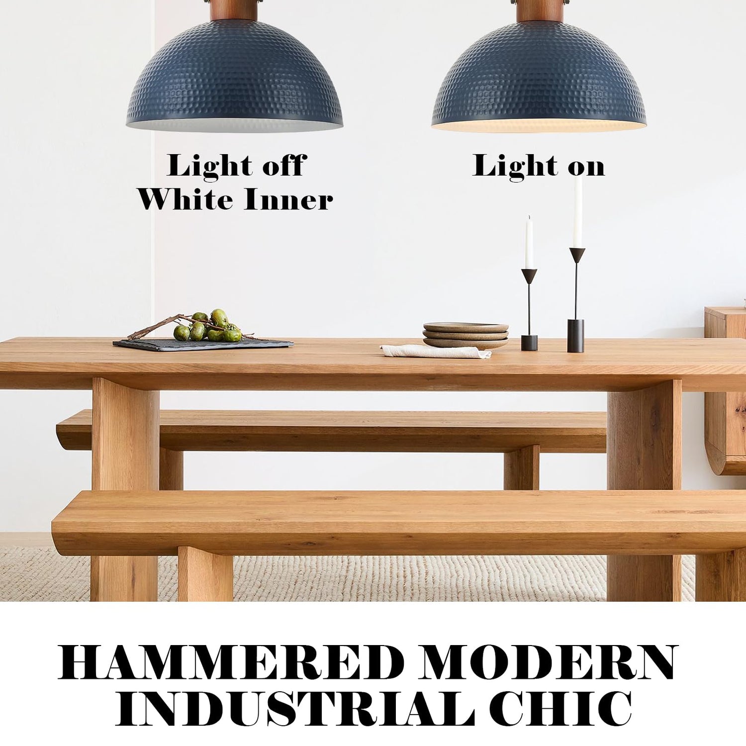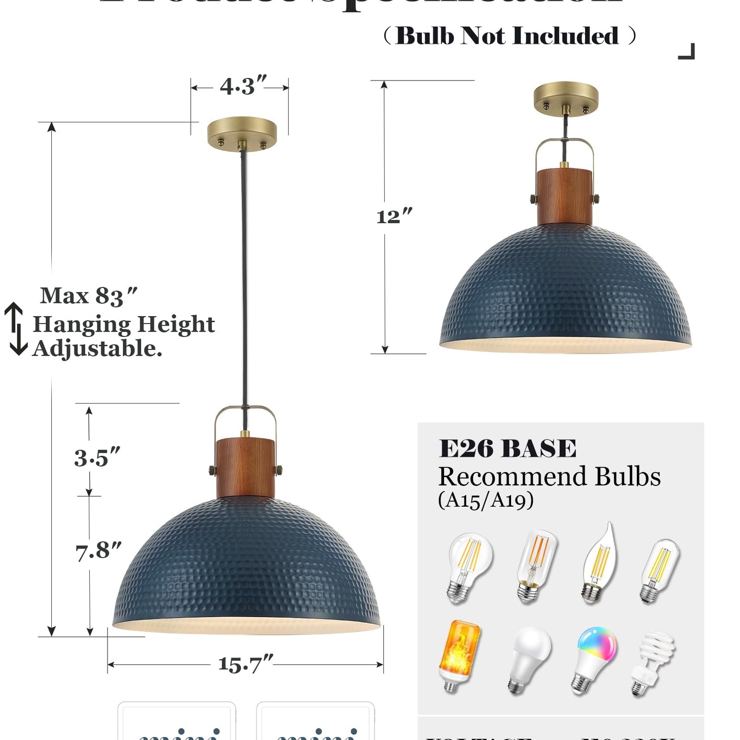 ELYONA 16” Large Ash Wood Pendant Light with Hammered Blue Metal & Brushed Brass Handle Large Pendant Light Fixtures Modern Dome Hanging Lamp for Kitchen Island, Dining Table, Bedroom, Hallway