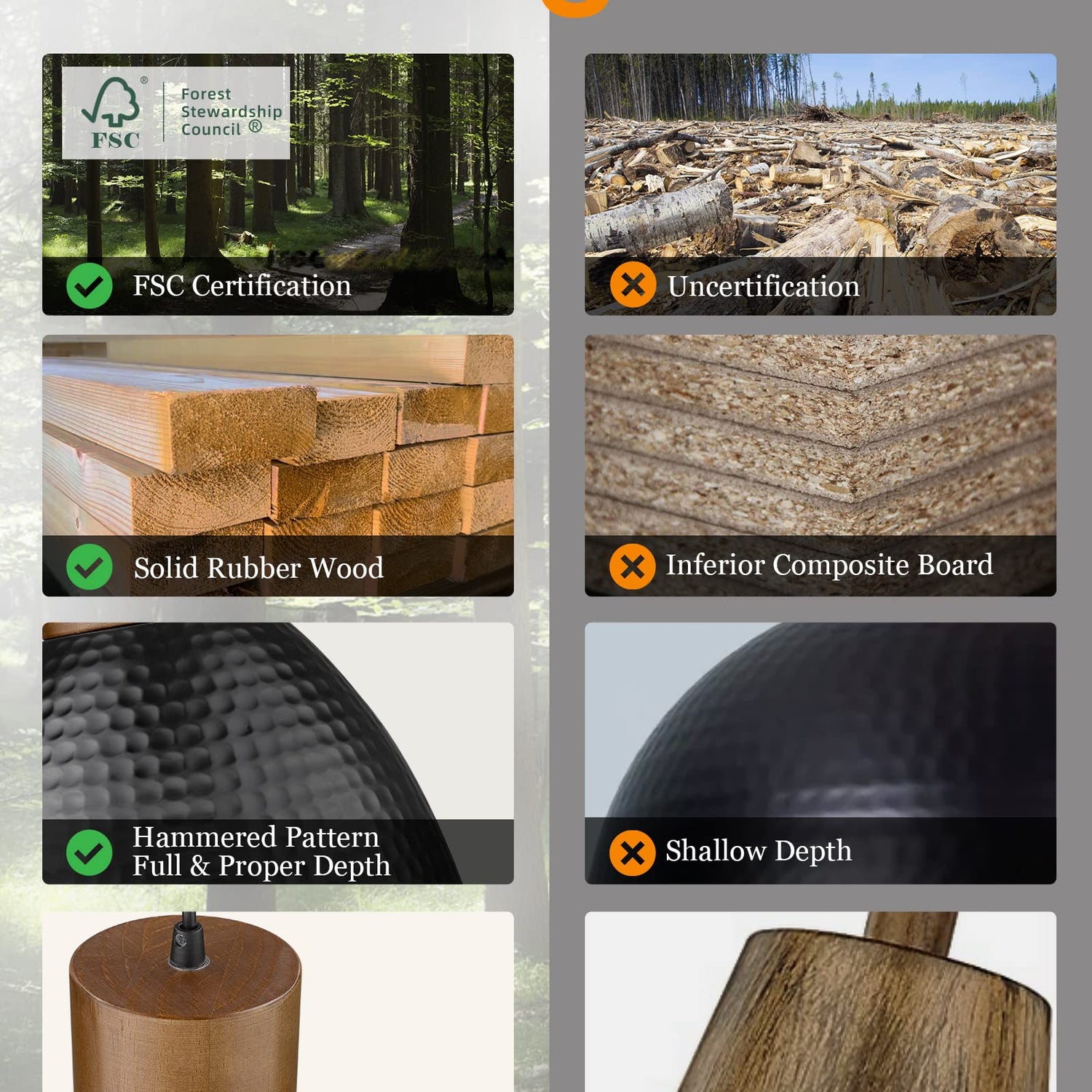 - 【Why can you trust ELYONA's Solid Wood?】①Made of FSC Certification Smooth Solid Wood which has represents that the timber used is following the strict environmental standards of FSC. ②Unlike fiberboard’s wood grain paper surface and glued with unknown woodchips inside, ELYONA solid wood has a waterproof coating that won't cause edge warping when meeting water and is glue-free, formaldehyde-free. ③ The pendant lamp has a certain weight to ensure that the wire will not bend when hanging