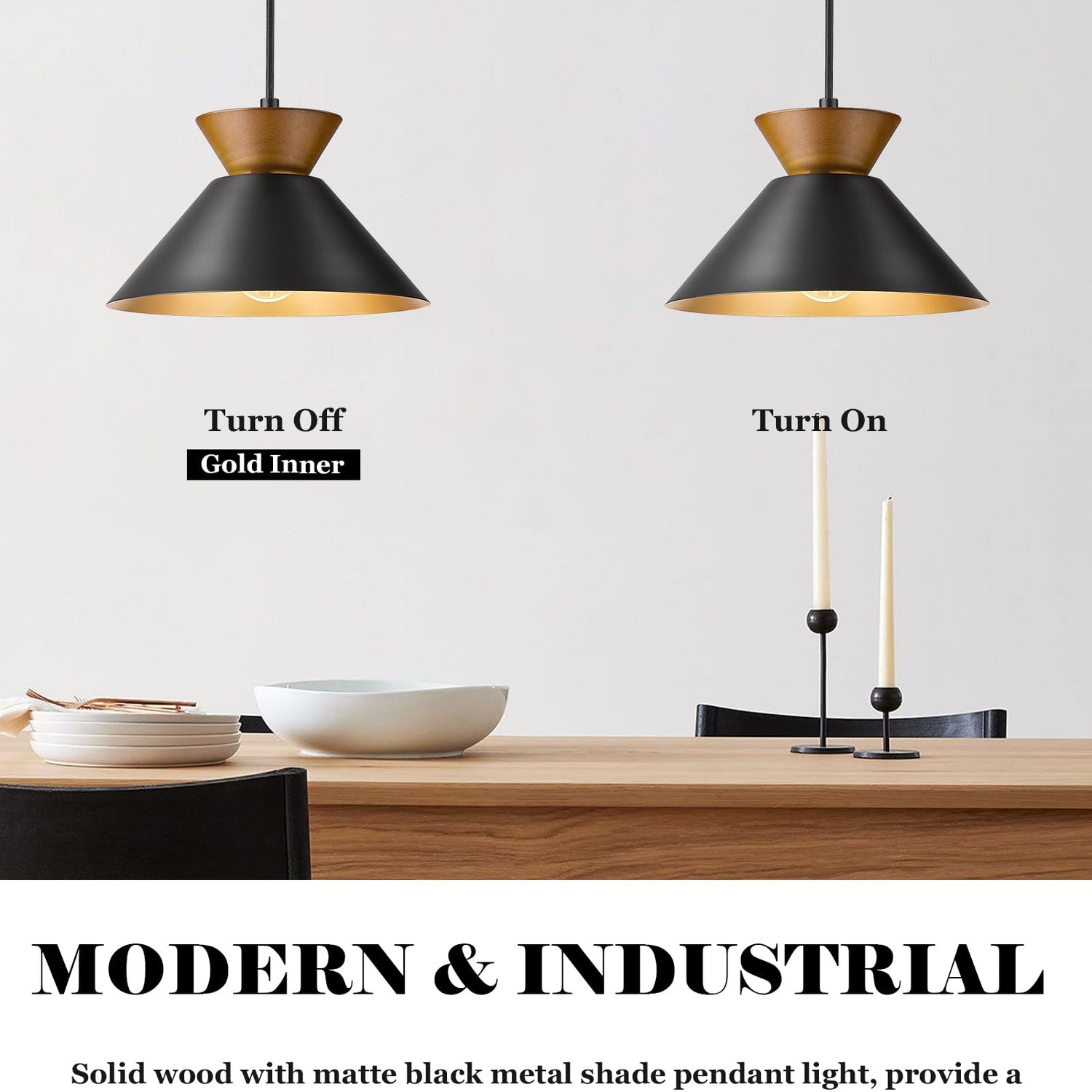 ELYONA Modern Pendant Light Kitchen Island, 10" Solid Wood Hanging Lamp with Matte Black Metal Shade & Gold Inner Finish, Farmhouse Pendant Light Fixtures for Dining Room Bedroom Living Room Hallway