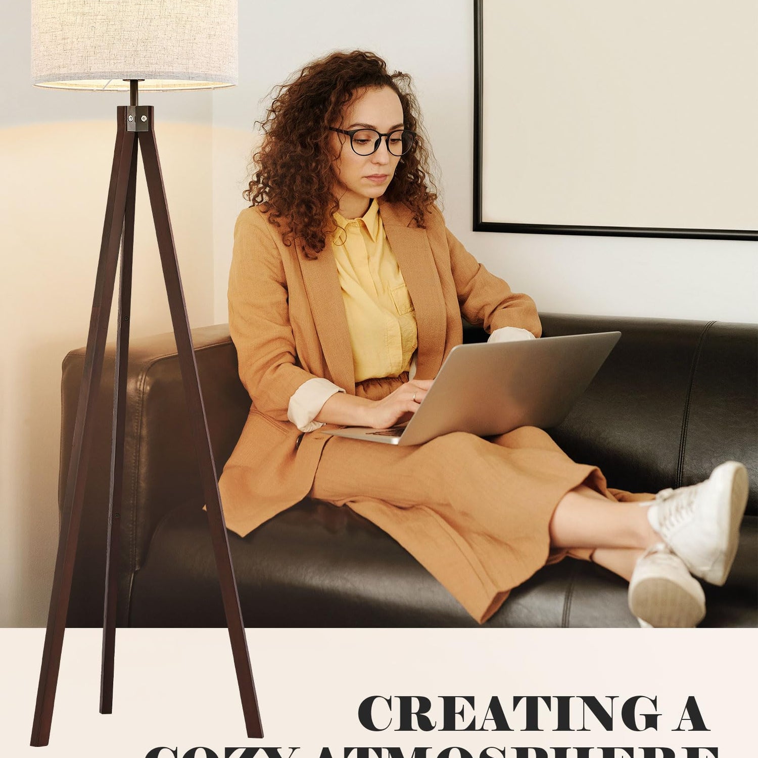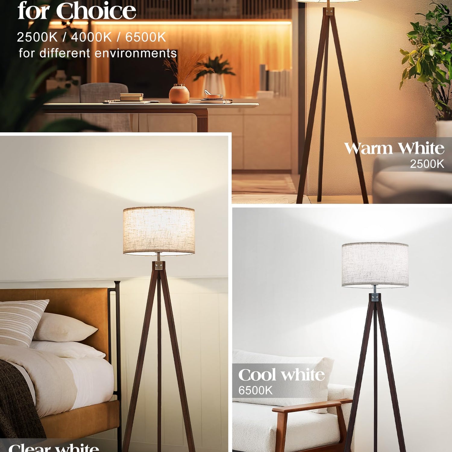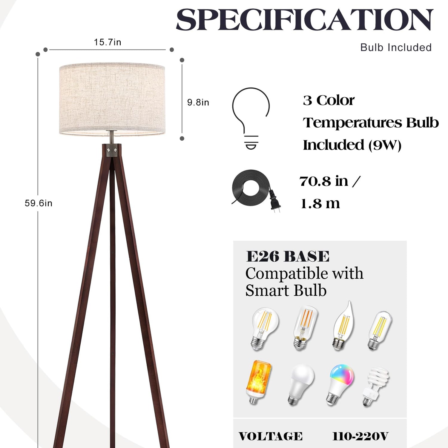 ELYONA Wood Tripod Floor Lamp, Mid Century Modern Reading Standing Light, Tall Studying Light with 3 Color Temperatures LED Bulb & Nature Linen Shade for Farmhouse Living Room Bedroom Office, Walnut