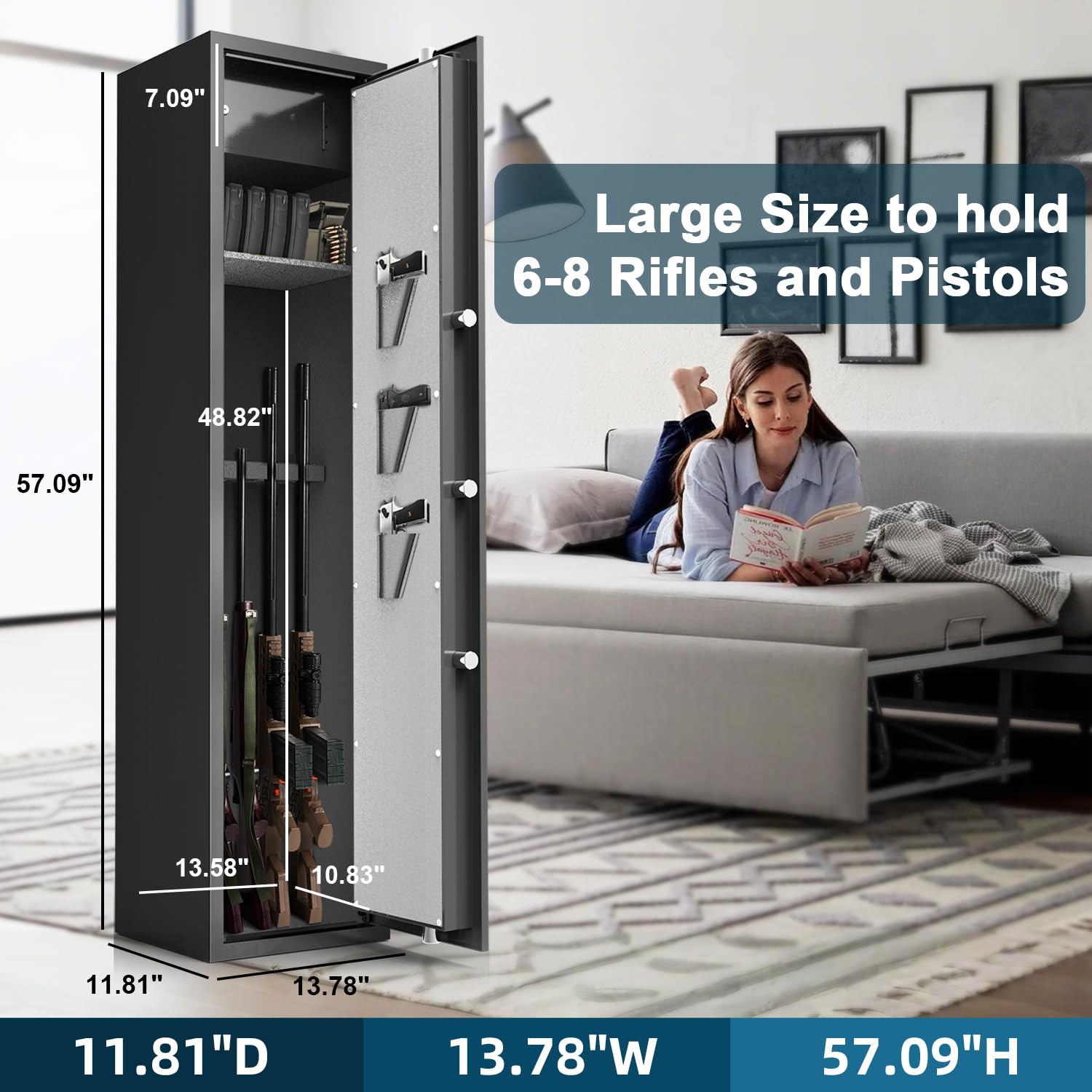 - 【6-8 Gun Safe with Removable Shelves】This gun safes for rifles and shotguns measures 13.78"W x 11.81"D x 57.09"H. It also comes with removable shelves, you can adjust the storage space by adjusting the shelves. A safe and convenient storage solution for your firearms
