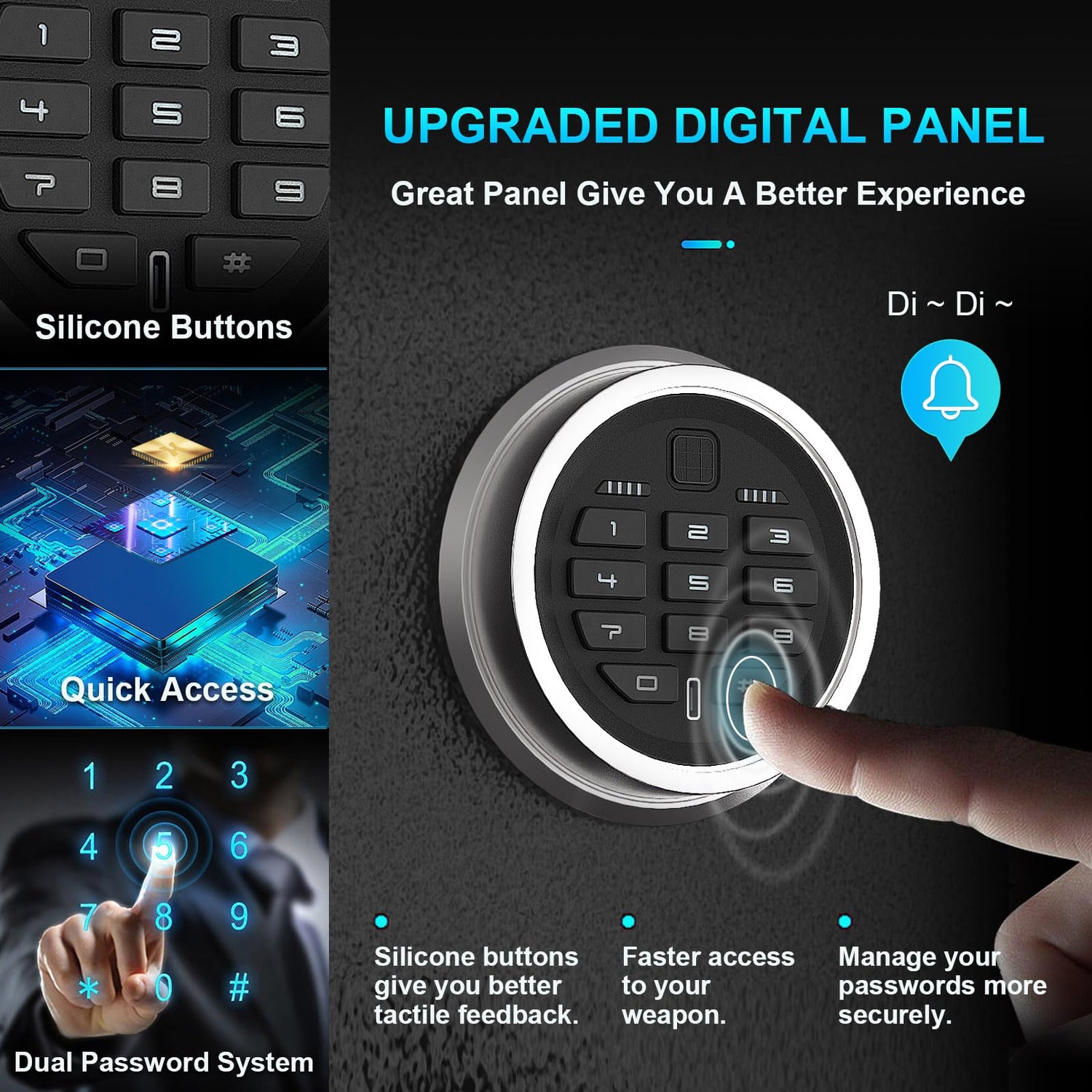 - [Upgraded Quick Access Gun Safes] The panel of large gun safe with silicone material buttons. This is our novel design to ensure you have better tactile feedback during unlock. Faster identification chip allows you to open the rifle safe within 1s after entering the password. 180° door opening angle allows you to quickly access your guns.