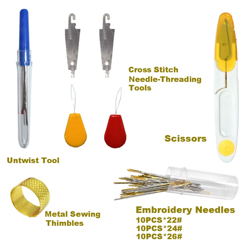 - 【EMBROIDERY TOOLS】- You can easily start the cross stitch floss project with these tools: 20 pcs 3 size embroidery needles, 2 pcs cross stitch needle-threading tools,2 pcs metal sewing thimbles,1 pcs scissors,1 pcs untwist tool, 1 pcs metal sewing thimbles