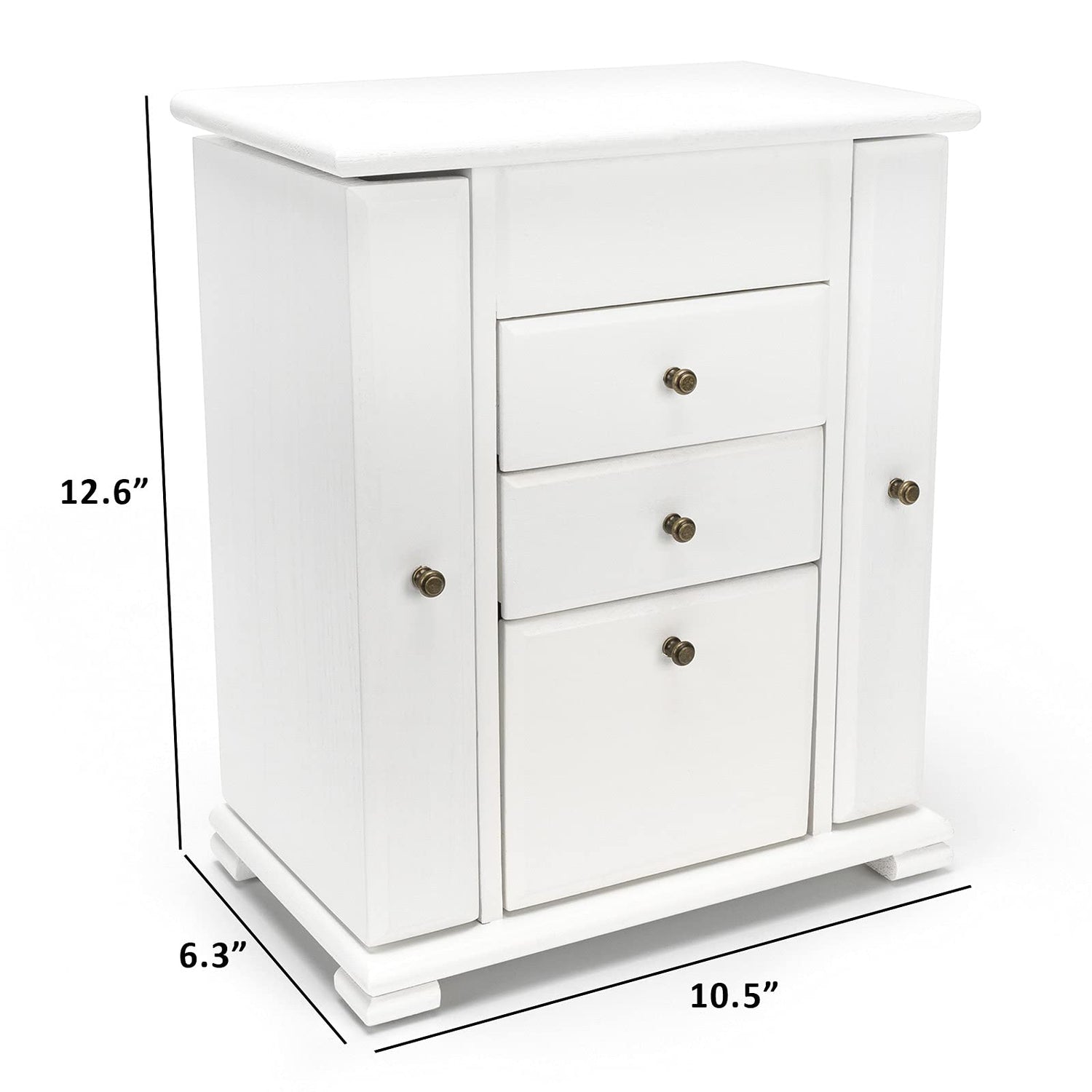 Details: Emfogo Jewelry Organizer Box with Mirror - Jewelry Holder for Store Necklace Bracelet Earring Ring and BroochMaybe you always be annoyed about can't find jewelry.Maybe you always be annoyed about mess of jewelry.Maybe you always be annoyed about losing jewelry.This jewelry box can go a long way in keeping your collection organized and in tip-top shape~!Rings Wave HolderLinen wave ring holder could place about 24 rings. Drop-down structure is easy to store your favorite rings.Necklace Holder Door2 side door equipped 8 bronze hooks and wood tray, can hang your necklace well and protect it from scratches.Inside MirrorThe top of the jewelry box is an 8.8 x 4.7 inch mirror. It could help you to wear and match your jewelry. DrawerEach drawer has a different layout. Earings, bracelets, watches and other accessories could be assigned to different place.Solid WoodThe rustic solid wood material with torched finish gives it a classic feel. Fit to the farmhouse style room.Ideal GiftThis jewelry box must be a wonderful gift for who you cherish, it will be the most exquisite and favorite gift she has ever received.