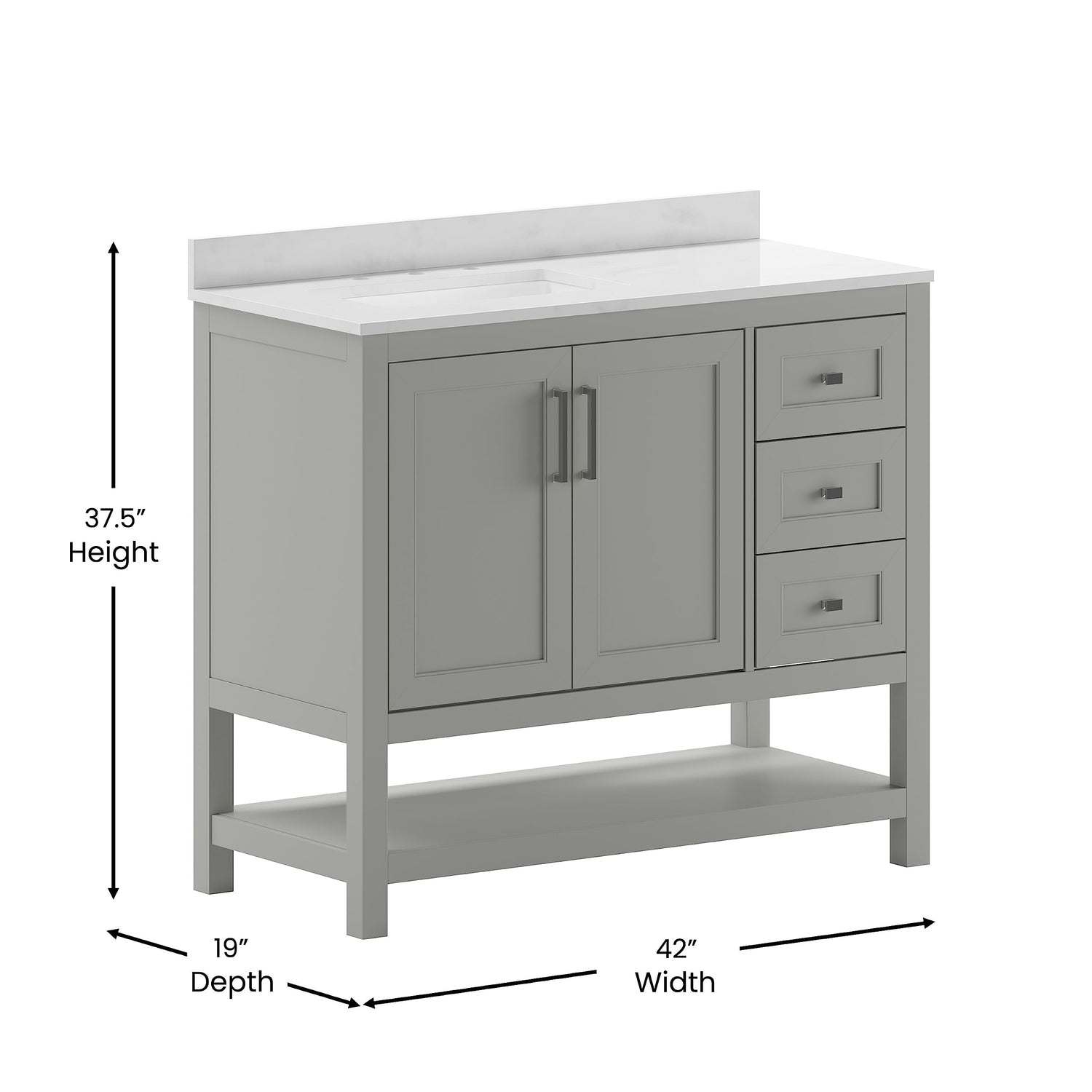 - Product Dimensions: 42"W x 19"D x 37.5"H; Interior Shelf Size: 37.5"W x 14.75"D; Interior Cabinet Size: 37.5"W x 14.75"D x 18.75"H; Sink Basin Size: 20.25"W x 13"D x 7.5"H; Pre-Drilled Faucet Holes with 8" Spacing; Lower Shelf Size: 37.5"W x 18.5"D x 6.5"H; Drawer Size (3): 11.1"W x 14.5"D x 6.25"H