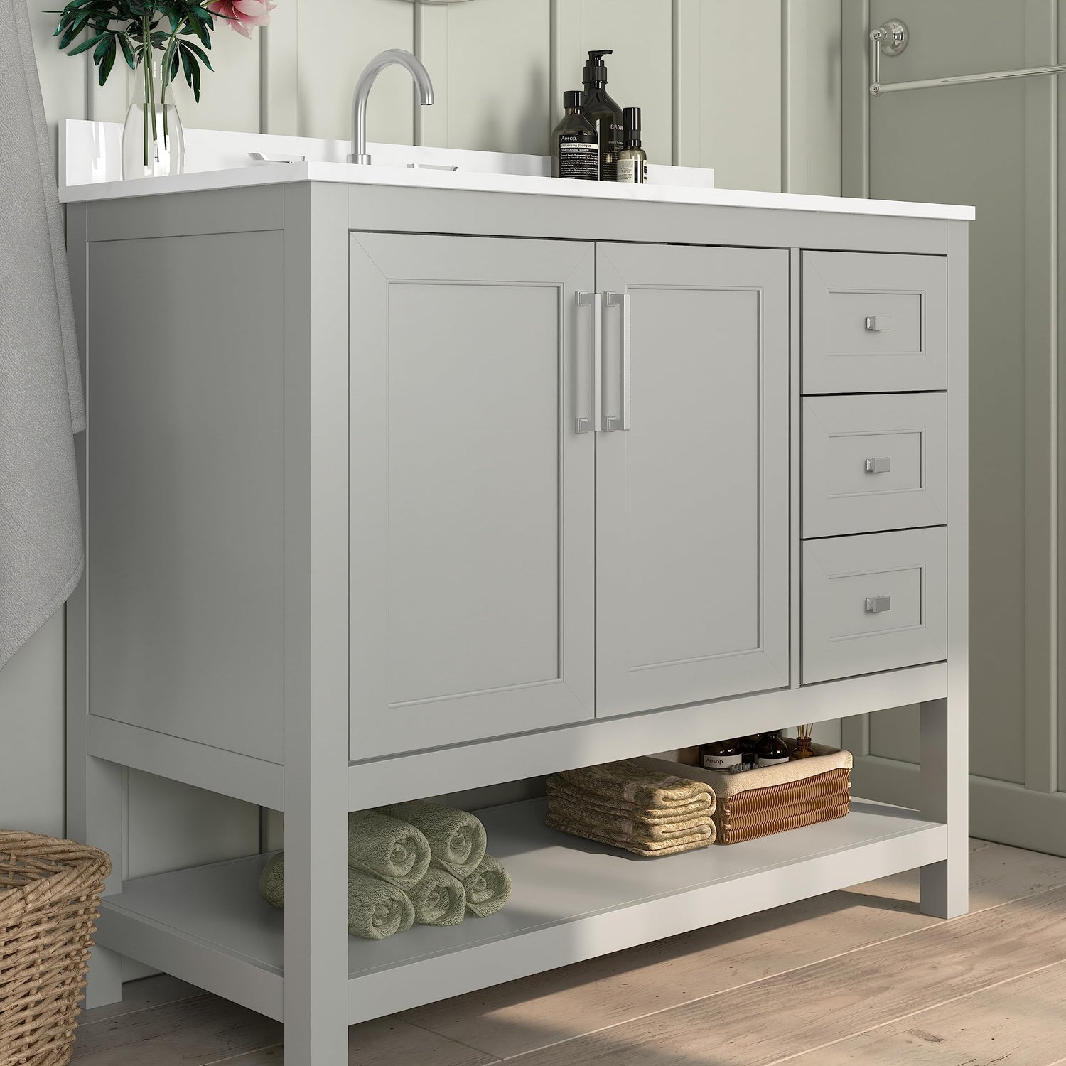 Beautiful style is just the tip of the iceberg for this upmarket vanity set. Soft close doors open to reveal ample interior storage with an adjustable height shelf then close whisper quiet. A lower open storage shelf is perfect for linens or decor and the addition of 3 easy glide drawers ensures you have plenty of space for your essentials. The engineered wood cabinet will stand up to moisture and humidity, holds up to 400 lbs. static weight, and arrives with adjustable floor glides for a level surface.