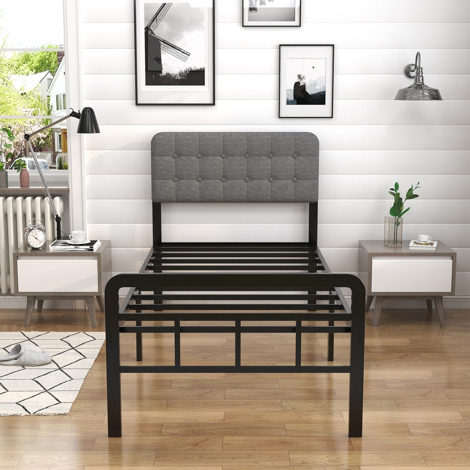- Black minimalistic metal bed frame with grey upholstered headboard will fit any style of your room.