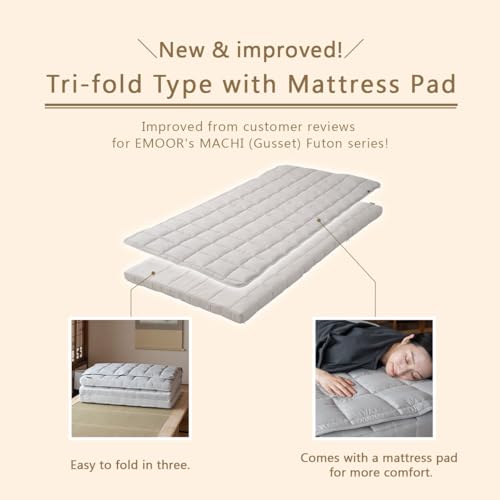 - [FUTON + MATTRESS] Have it both ways, the softness of Japanese Shikifuton (Shikibuton) and the durability of Western Mattress. Tri-fold type is now available for EMOOR's well-selling MACHI (Gusset) Futon series! Comes with a fitted pad for more comfortable sleep.