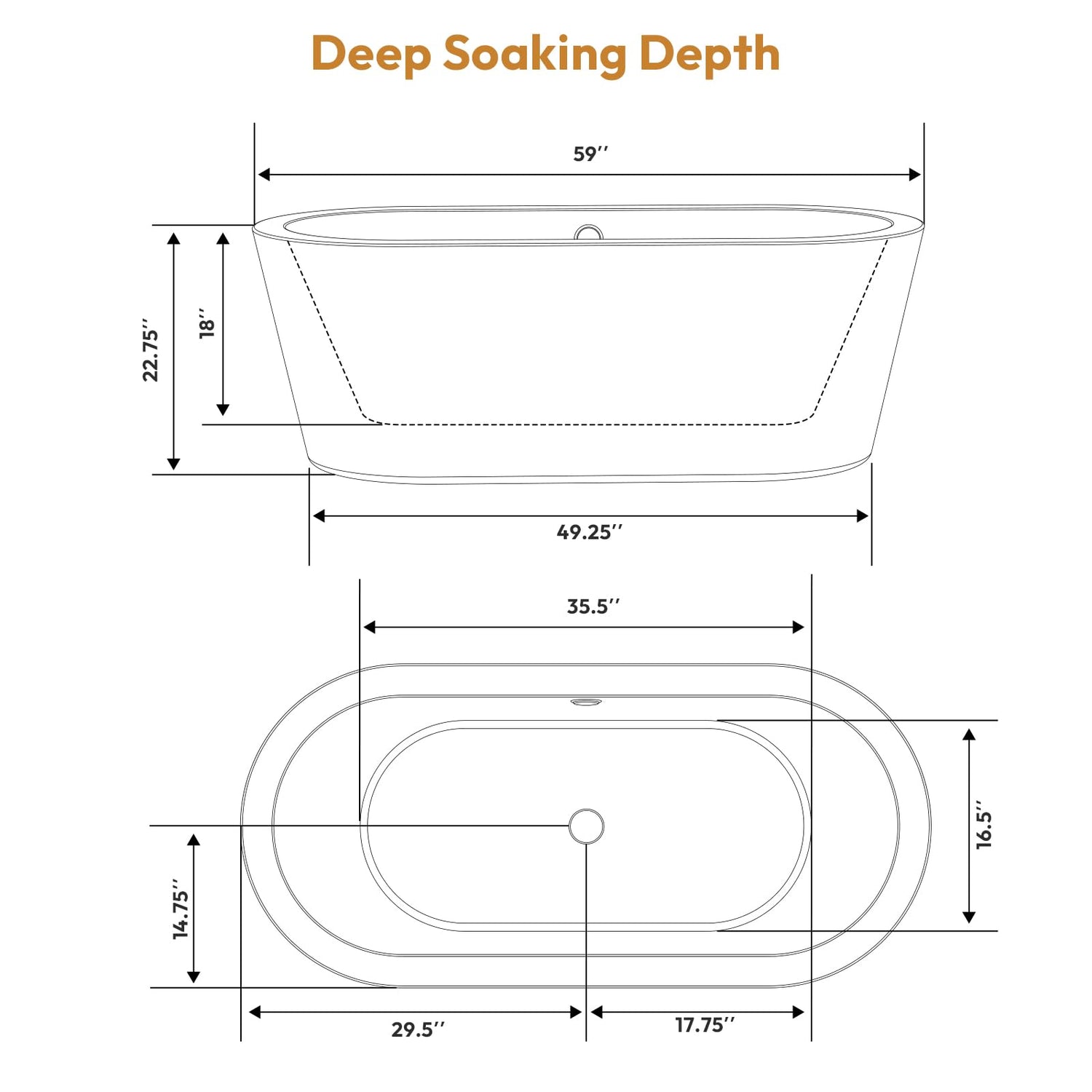 - 🐳 PERFECT BATHING EXPERIENCE: The Empava freestanding tub measures 59.05"L x 29.52"W x 22.83"H. With an effective soaking depth of 15.16” and a 53-Gallon water capacity, allows you a deeper soak. The gentle sloping curves are ergonomically designed to fit your body’s curves and provide support for your back and lumbar, bringing you a comfortable bathing experience