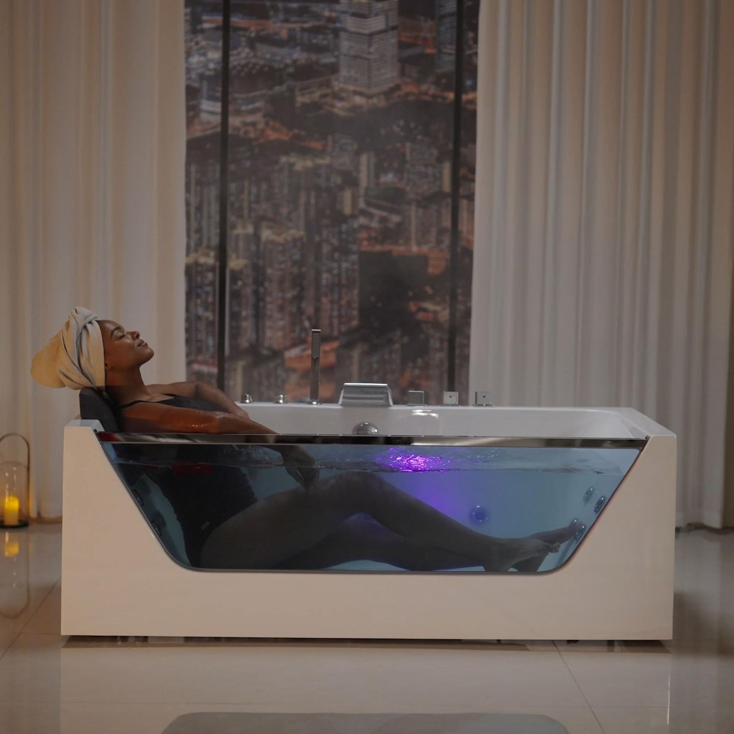 - [PREMIUM QUALITY] The acrylic whirlpool tub featuring acrylic reinforced with fiberglass and supported with a stainless-steel frame makes the bearing capacity is up to 660 LBS. The front panel is made of 5/16" thick (8mm) tempered glass which will add the finishing touch to any bathroom.